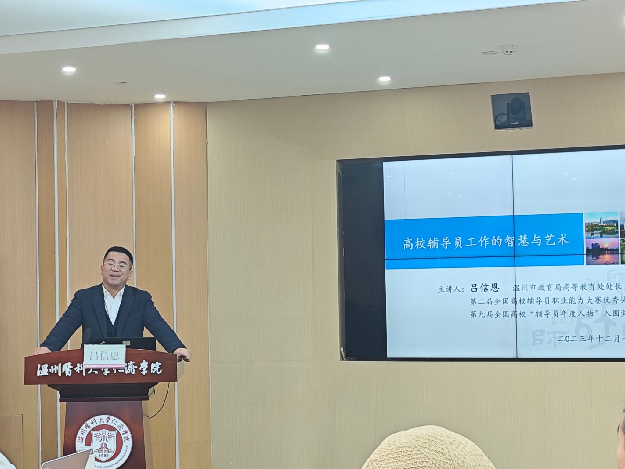 为进一步提升辅导员理论水平和专业素养,推动辅导员队伍专业化、职业化发展,提升大学生思想政治教育质量,12月1日下午,学院举行新一期“辅导员思享会”,温州市教育局高教处处长吕信恩应邀来校作“高校辅导员工作的智慧与艺术”专题讲座。学院党委副书记刘洁出席讲座,全体辅导员参加讲座。活动由学院党委副书记姜旭英主持。