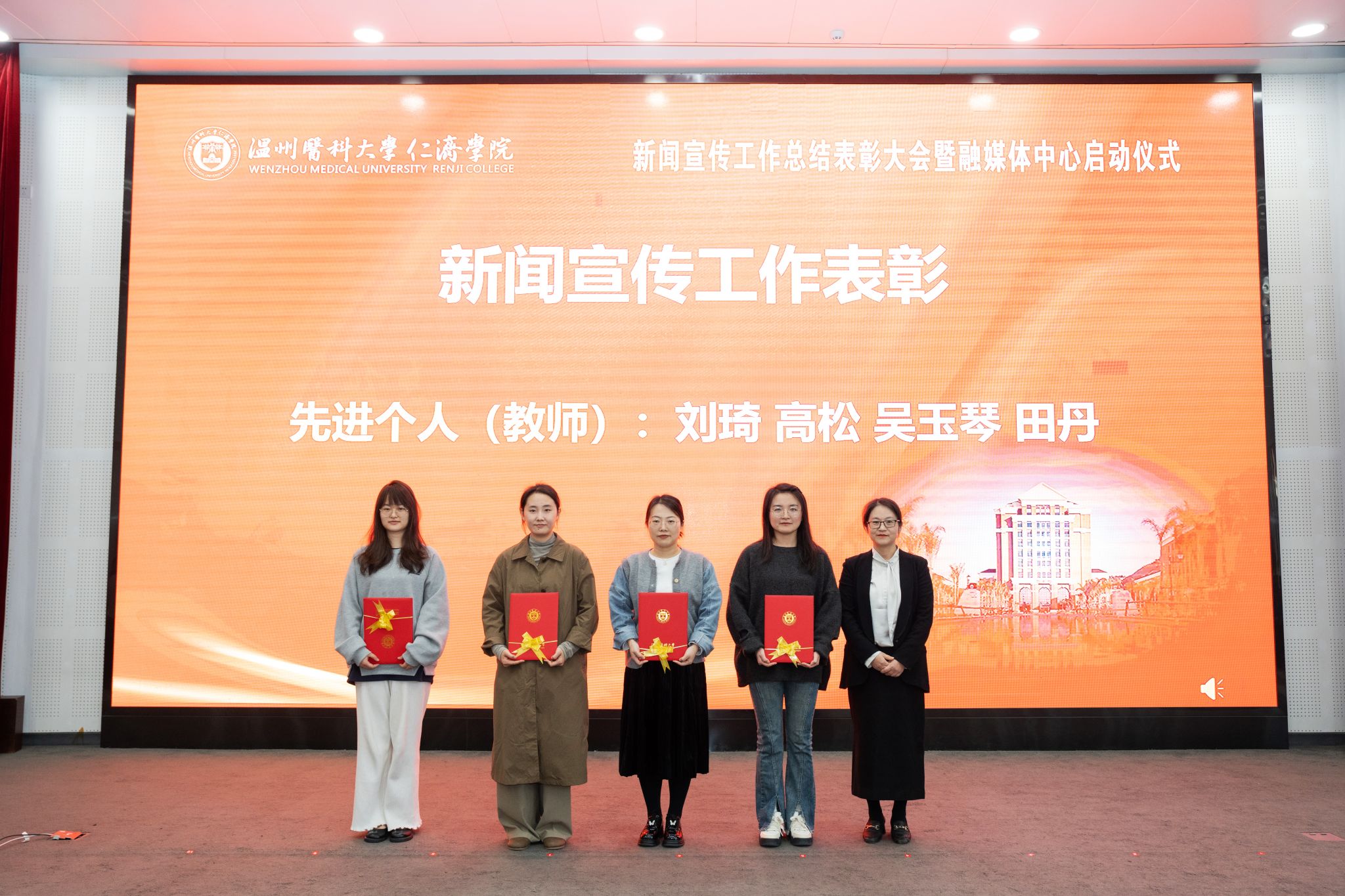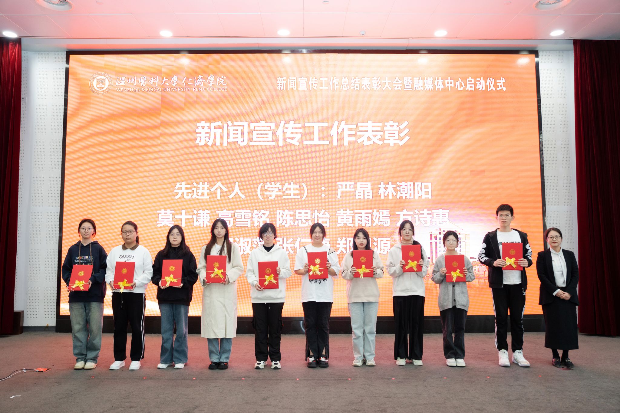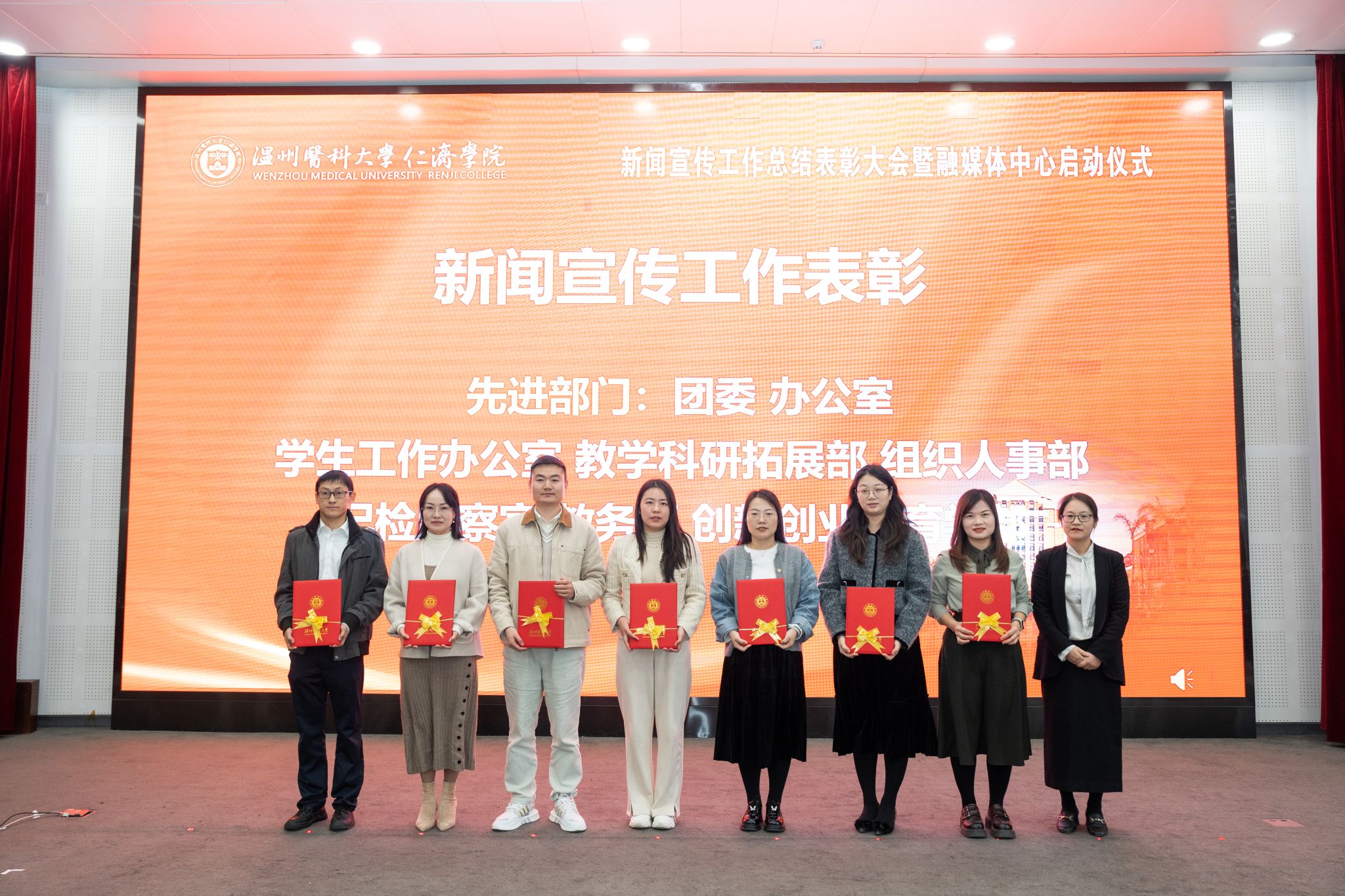 为切实做好新时代宣传思想文化工作,创新融媒体背景下校园新闻宣传工作的方式方法。11月29日下午,91吃瓜 新闻宣传工作总结表彰大会暨融媒体中心启动仪式于滨海校区仁心厅顺利举行。温州市新闻传媒中心广电总编室主任陈泰涨、温州广电集团有限公司常务副总经理郑雨辰、温州市新闻传媒中心融媒发展部副主任叶青及浙江日报、浙江教育报、温州日报、温州晚报、温州新闻客户端等十位资深媒体代表莅临此次仪式。91吃瓜 党委书记彭红雷、党委副书记姜旭英出席,学院300余名师生代表共同参与。仪式由学院办公室主任林瑾主持。