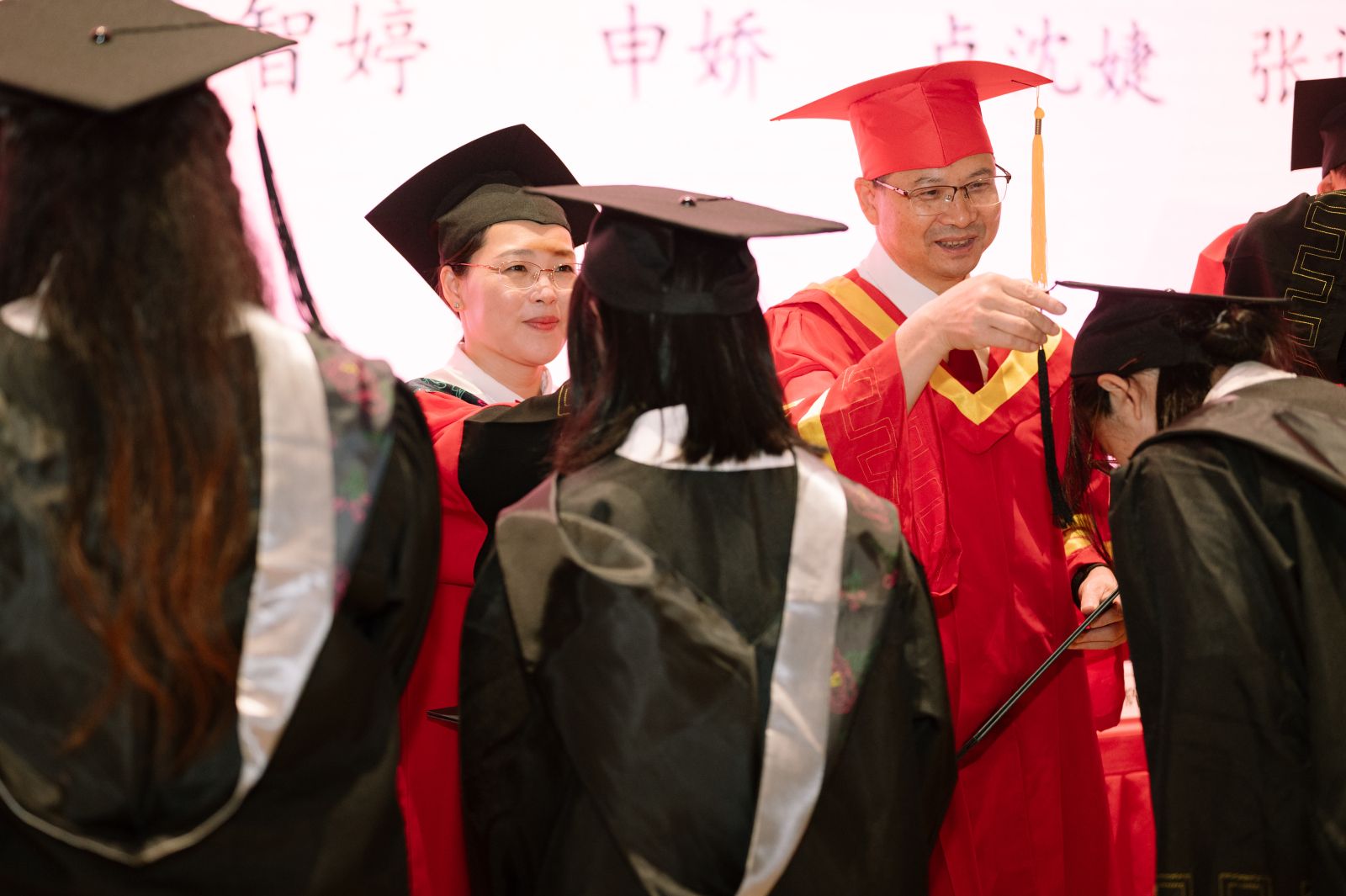 学位授予仪式上,毕业生们依次上台,接受拨穗正冠,标志着学业的圆满完成。