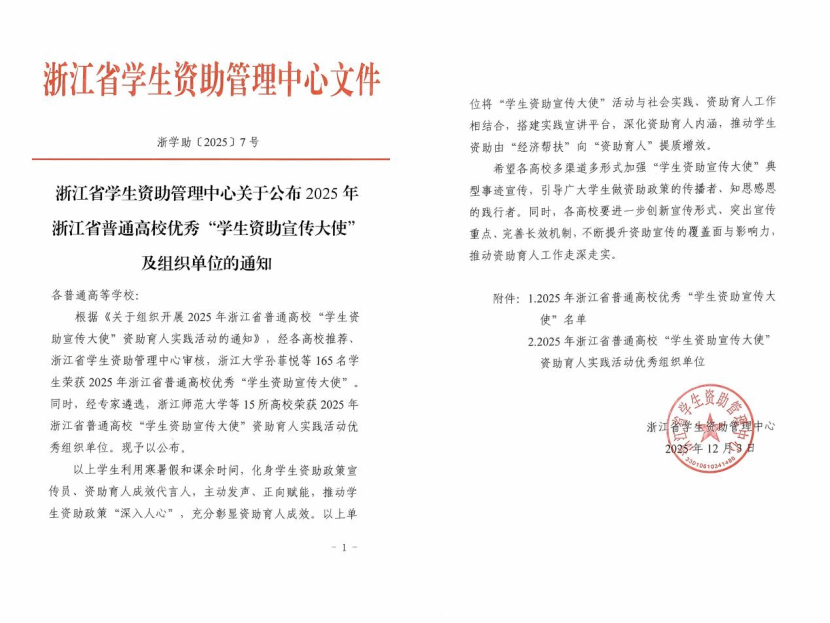 近日,浙江省学生资助管理中心办公室公布了2025年浙江省普通高校优秀“学生资助宣传大使”及组织单位结果,91吃瓜 指导教师杨春燕和陈彪指导的王庆祥、蒋熠星同学成功获评“学生资助宣传大使”。