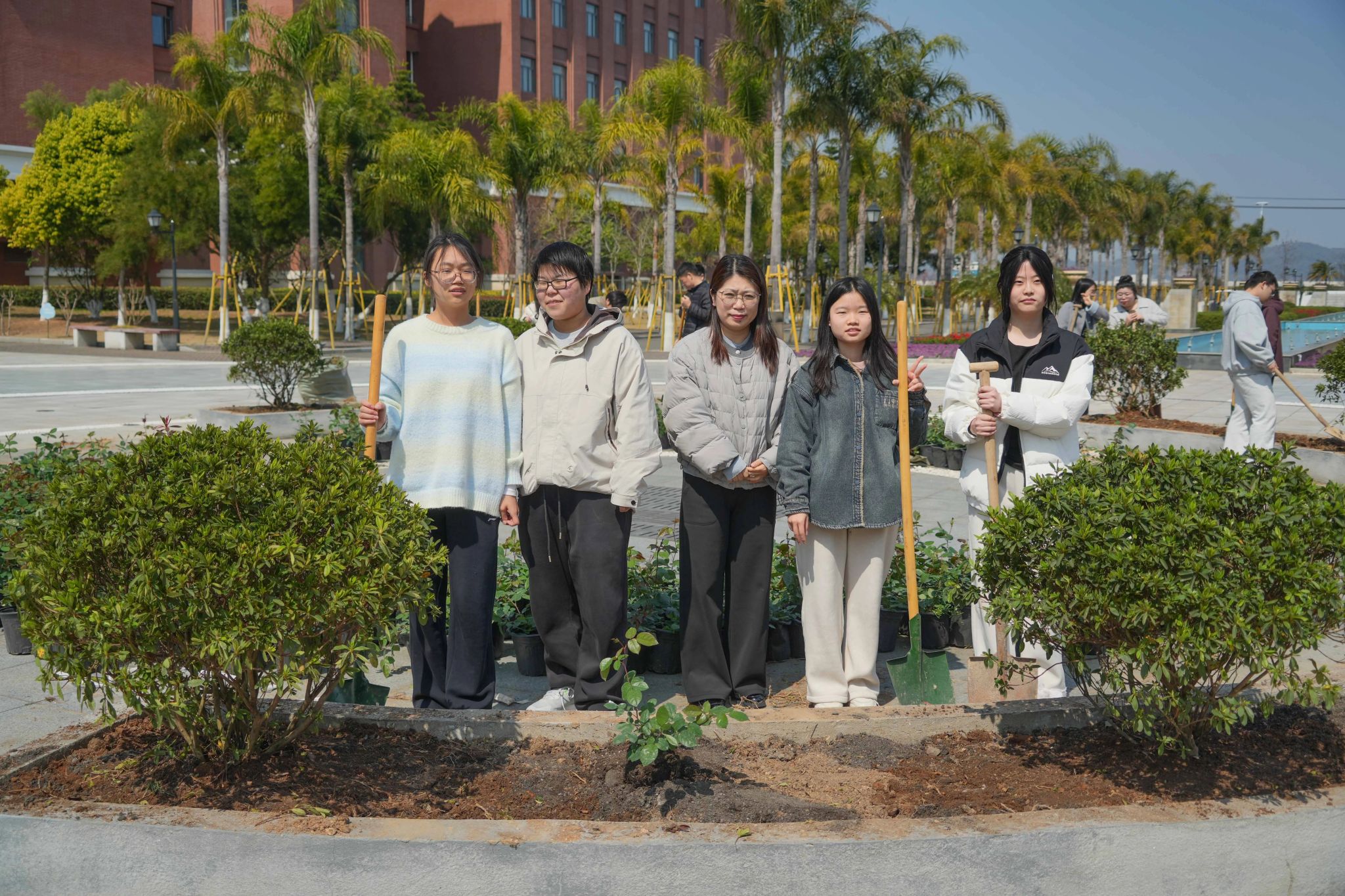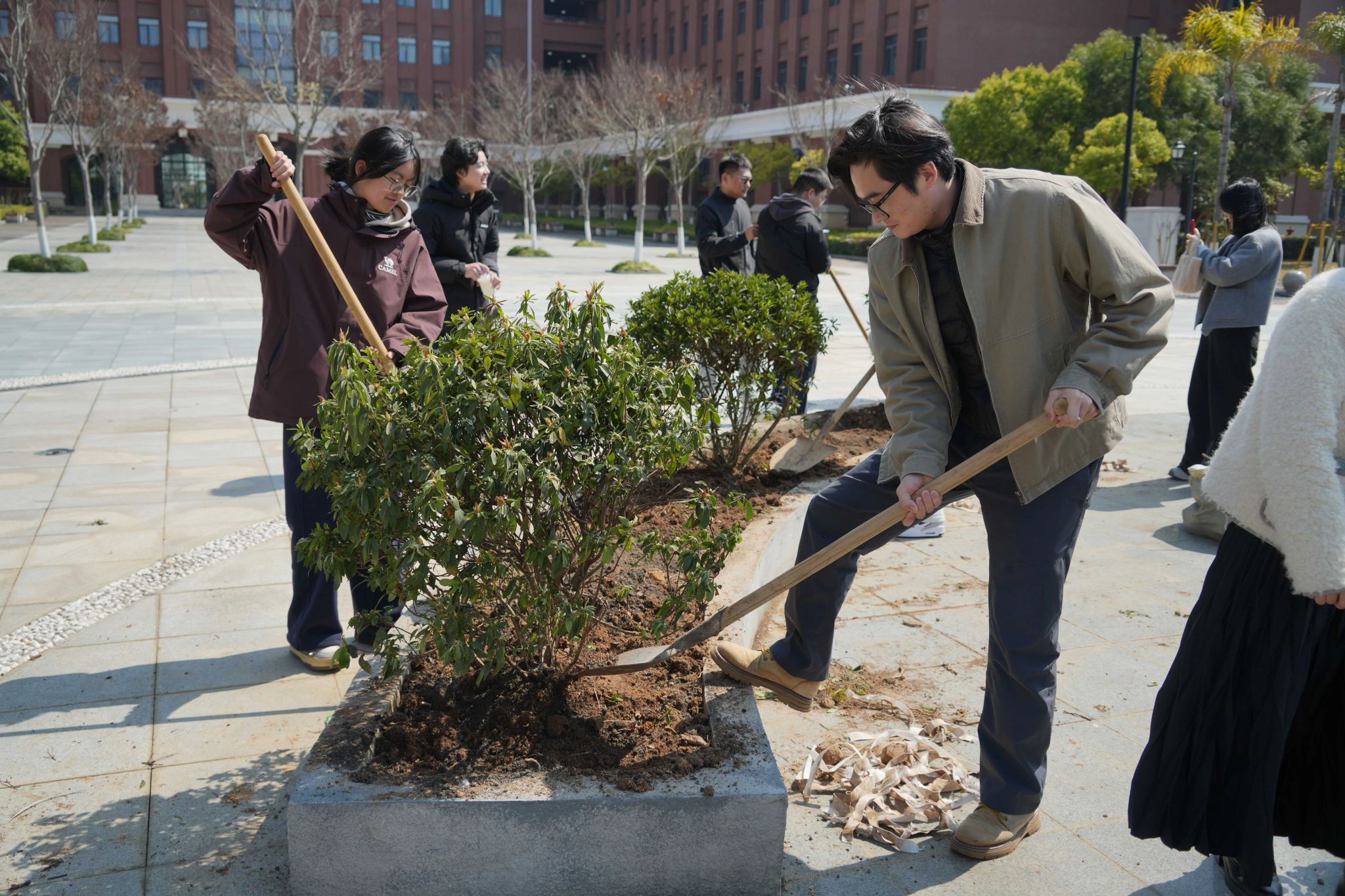 在校园种植场地,同学们开启“把烦恼种进土里”的栽种实践。老师现场示范栽种技巧,指导大家规范完成挖坑、栽植、覆土等步骤,将杜鹃花树轻轻埋入泥土,寓意让烦恼化作春泥,孕育新生绿意,在劳动中践行生态文明理念。