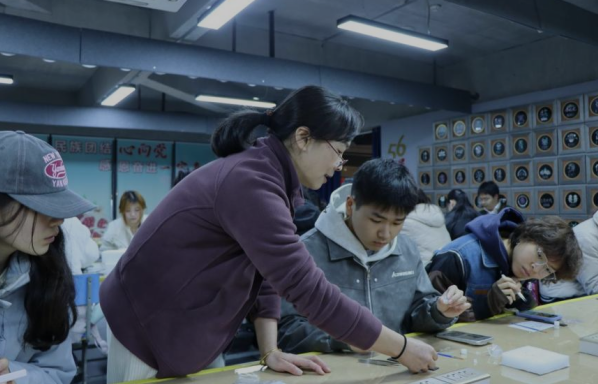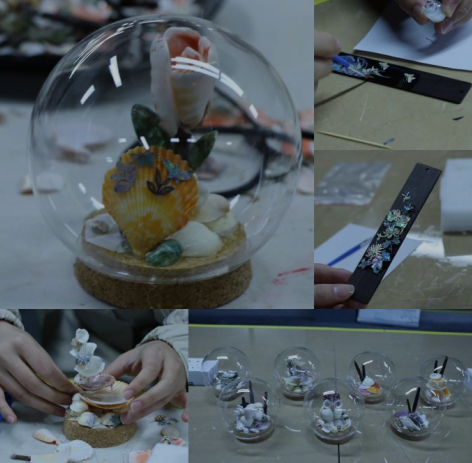 在东海贝雕艺术博物馆,学员们沉浸式感受省级非物质文化遗产——洞头贝雕的巧夺天工,详细了解其发展历程、技法演变及现代创新应用。在博物馆工作人员的指导下,学员们亲手体验贝堆造景、梅兰竹菊书签体验等工艺,感受海洋文化与工匠精神的深度融合。此次研学活动中,曾担任一年多贝雕博物馆讲解志愿者的朱同学表示:“再次回到贝雕博物馆倍感亲切,希望更多的游客能够来到贝雕博物馆,了解贝雕螺钿工艺的发展历史及精美工艺,让螺钿技艺既能传承发扬,又能创新发展。”