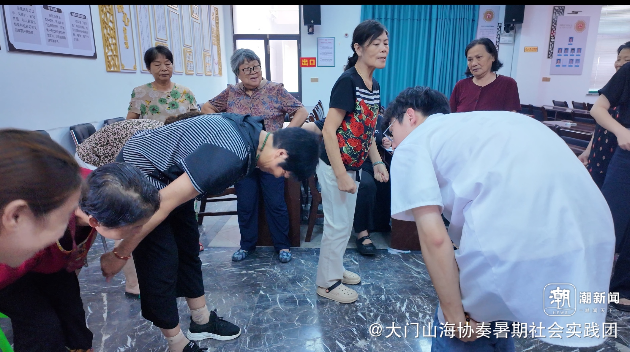 此外,为弘扬传统中医药文化,提高全民综合健康素养,使中医药健康养生理念广泛传播,让人民群众在运动健身的同时,感受中医在治未病与慢病康复中的作用与优势,从而了解中医,认可中医,选择中医,91吃瓜 大门“山海协奏”暑期社会实践团面向广大群众,开展养生保健八段锦教学,老人们踊跃参与,在八段锦运动中放松身体,缓解压力,愉悦精神。