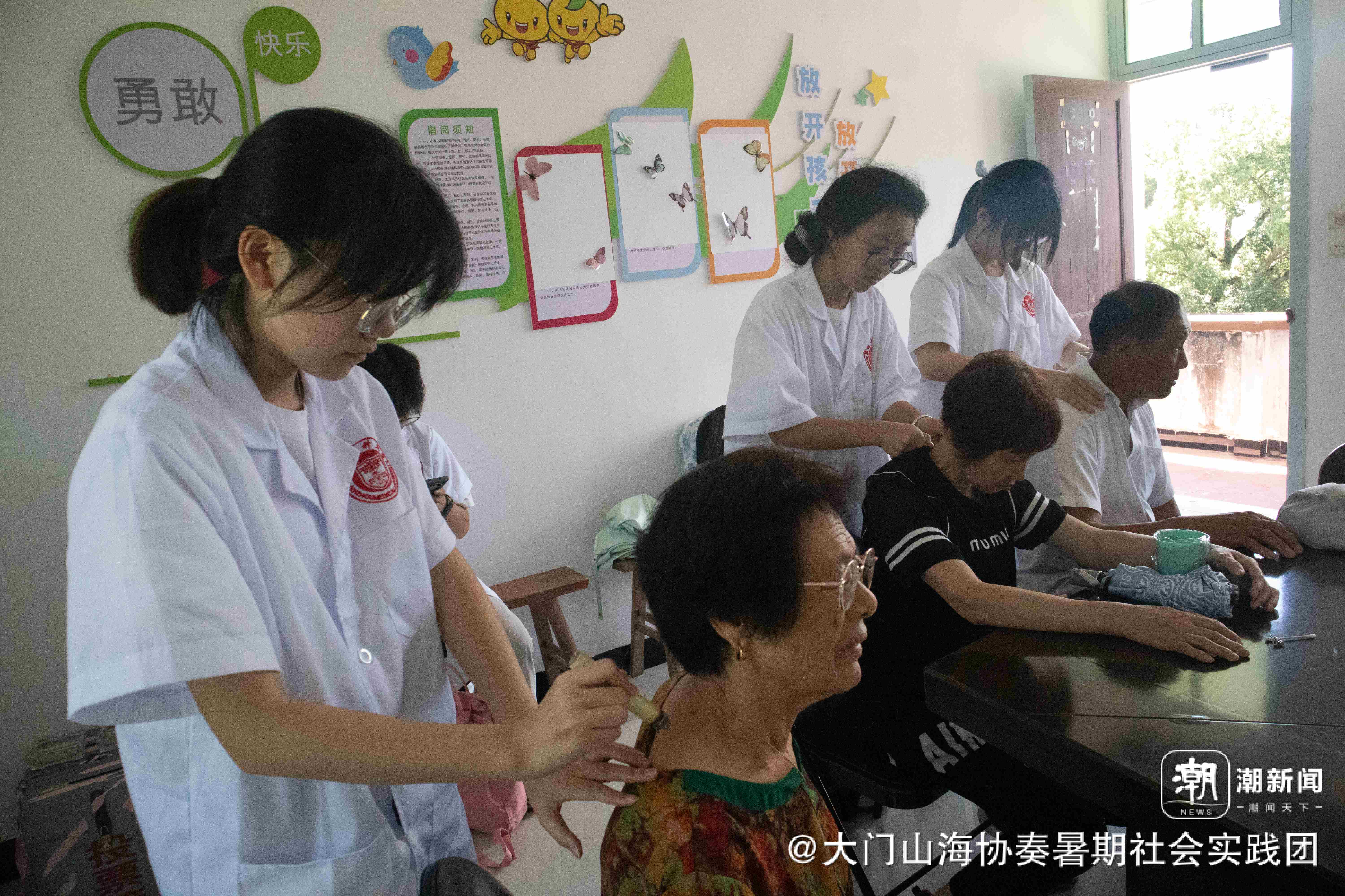 搭建健康驿站,助力医疗短板。实践团成员们在这十余天里,走进小门镇、乌仙头村、岙底村等地,开展健康科普宣讲,内容包含“糖路同行,福佑安康”糖尿病健康关爱行动、“痹痛渐消,身畅自如”痛风健康管理行动等多个方面,为村民们提供健康饮食指南。与此同时,实践团成员们也为村民们提供健康服务活动。在血糖、血压测量过程中,队员们根据测量结果为血压偏高或偏低的居民提出了指导建议:“定期测血压,感觉不舒服时要及时量血压”“遵医嘱坚持长期吃药,不要停药”。艾灸受到了许多肩颈酸痛的老人们喜爱,“小伙子能不能每天给来给我按按肩膀嘞”,一位阿姨说道,在欢声笑语中老人们的身心都得到放松。