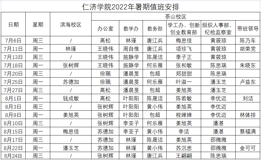 (一)暑假期间安排领导干部和工作人员每周一、周三分别在茶山校区和滨海校区值班(具体名单见下表)。茶山校区值班室设在7A-108办公室,电话:86699388;滨海校区值班室设在3309办公室,电话:63355856。保卫处安排人员巡查,24小时报警电话:86363110(学院路校区)、86699110(茶山校区)、63366110(滨海校区)。紧急情况需及时向分管领导及茶山校区值班处长报告。