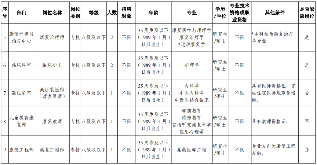 神经康复医师(博士)、心肺康复医师(博士)、康复治疗师、临床护士、康复工程师5个紧缺岗位开考比例不受人数限制。其余岗位通过资格初审的报名人数应不少于计划招聘人数的3倍,否则相应核减有关岗位招聘人数直至取消招聘计划。