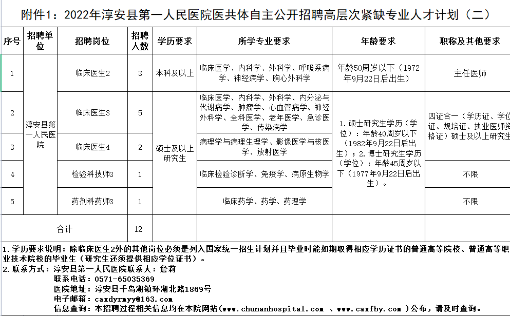 2022年,淳安县第一人民医院医共体因工作需要,决定面向社会自主公开招聘事业编制高层次紧缺专业人才12人。现将有关事项公告如下:
