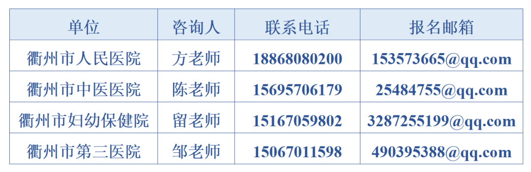 招聘公告在衢州市政府门户网站市卫健委部门公告公示栏、健康衢州微信公众号对外发布,具体招聘工作按报名、资格审查、考试、考核体检、公示聘用等程序进行。
