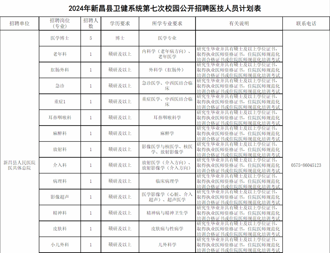 2024年我县卫健系统第七次校园公开招聘计划招聘医技人员26名。具体招聘单位、岗位、人数和报考资格条件,详见《2024年新昌县卫健系统第七次校园公开招聘医技人员计划表》(附件1)。