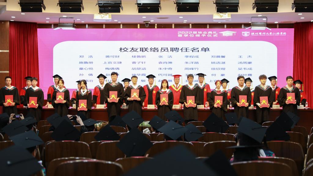 典礼上,省级优秀毕业生代表、校级优秀毕业生代表、考研卓越奖获奖代表上台接受表彰,本届毕业生(第二批)中,共有40名同学荣获省高校优秀毕业生,153名同学荣获校优秀毕业生称号,19名同学荣获考研卓越奖。同时,学院领导为校友联络员代表颁发聘书。