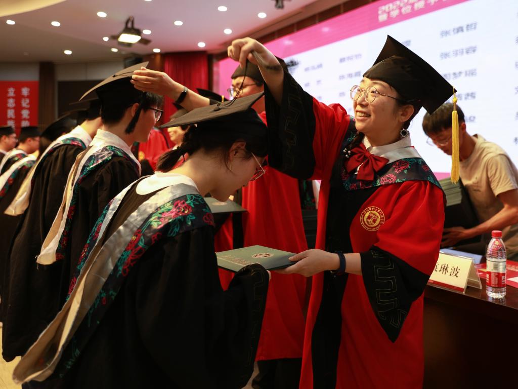 学院副院长金可可代表学位评定委员会宣读《91吃瓜 关于2022届毕业生学士学位授予的决定》,学士学位获得者一一上台,导师为毕业生拨穗,与他们合影,为他们送上临行前的殷殷嘱托。