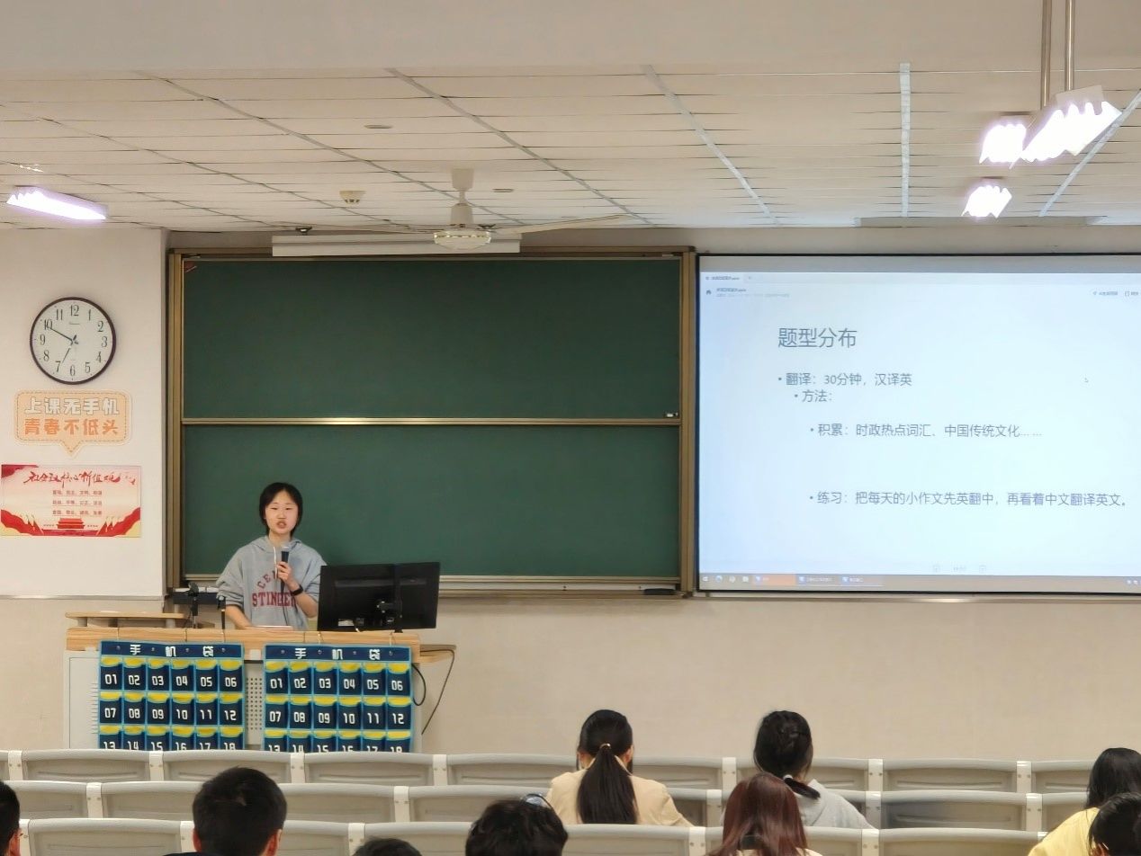紧接着,辅导小老师针对词汇记忆、阅读、听力、写作和翻译五大模块进行了详细的剖析。在词汇讲解环节,创新性地运用词根词缀、联想记忆法,将冗长难记的单词转化的简单易记,台下学生们或凝眉思索,或会心而笑,手中笔不停歇,记录要点;阅读理解方面,她讲解了如何快速定位答案、提高阅读速度和准确性的技巧。听力特训阶段,纯正英语发音的真题音频在教室环绕,辅导小老师详细解读连读、弱读规则,引导学生捕捉关键信息,同学们全神贯注聆听;写作指导时段,从剖析经典范文,到搭建实用句式,再到拓宽个性化写作思路,一步步为同学们铺就写作提分坦途。在翻译部分,另一位小老师则讲解了如何准确理解原文、运用恰当的词汇和语法进行翻译的技巧。