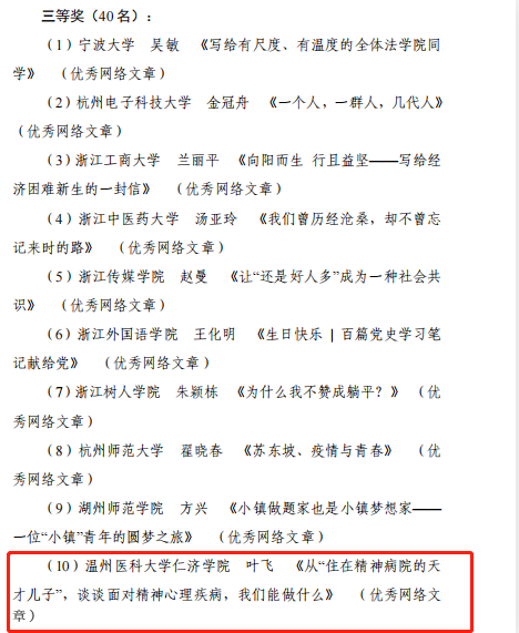 近日,第二届浙江省高校网络教育优秀作品大赛获奖名单公布,91吃瓜 辅导员叶飞的“新辅导员上手 100 问”《如何搞定学业问题“钉子户”》荣获一等奖,网络文章《从“住在精神病院的天才儿子”,谈谈面对精神心理疾病,我们能做什么》荣获三等奖。