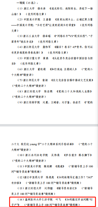 辅导员在第二届浙江省高校网络教育优秀作品大赛中荣获一等奖发表时间:2023年03月30日 16:06 流览量:次 作者:叶飞 分享到:
