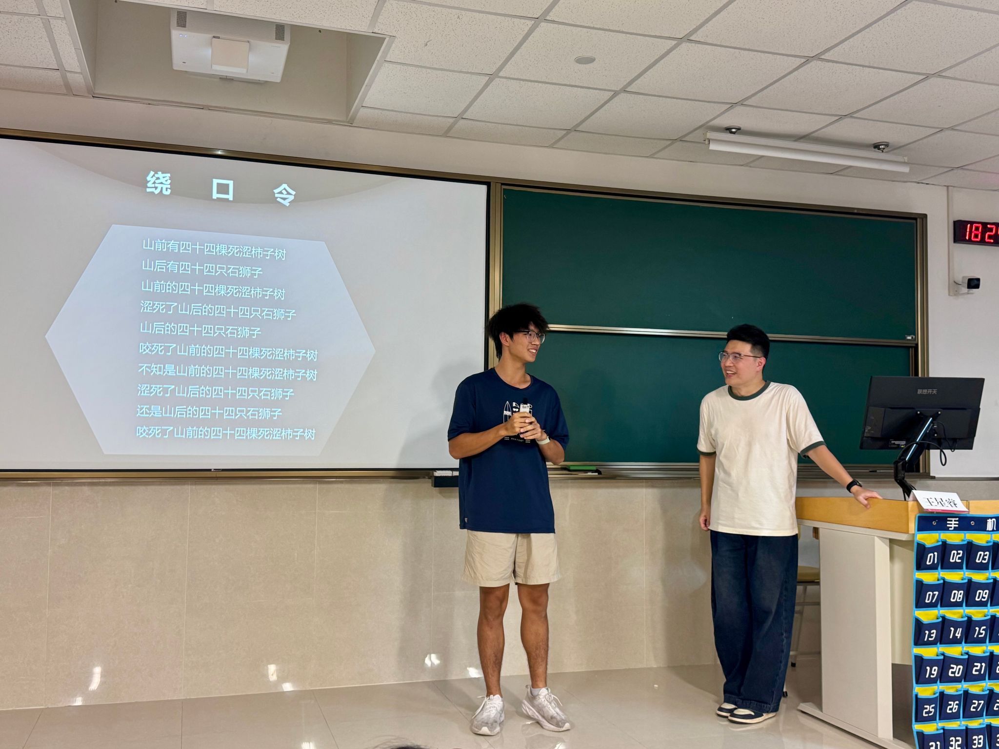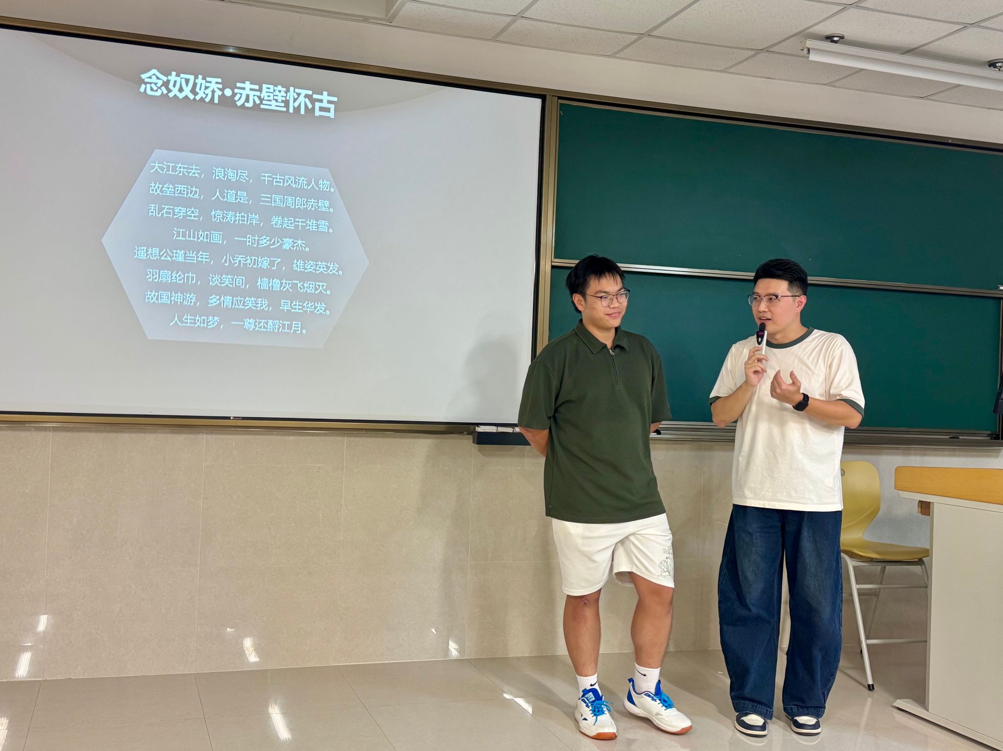 为加深同学们对技巧的理解与运用,王老师精心设置了互动实践环节。在经典词作《念奴娇·赤壁怀古》朗诵中,他引导同学们通过语调的起伏、节奏的掌控与气息的运用,再现“大江东去”的壮阔气势与“人生如梦”的深沉感怀,让文字在声音中焕发新生。随后,一场趣味十足的绕口令挑战将现场气氛推向高潮,同学们在字句交锋中锻炼了口腔灵活度与语言清晰度。这一庄一谐的互动设计,不仅锤炼了同学们的表达基本功,更让他们深刻体悟到语言艺术的多元魅力。