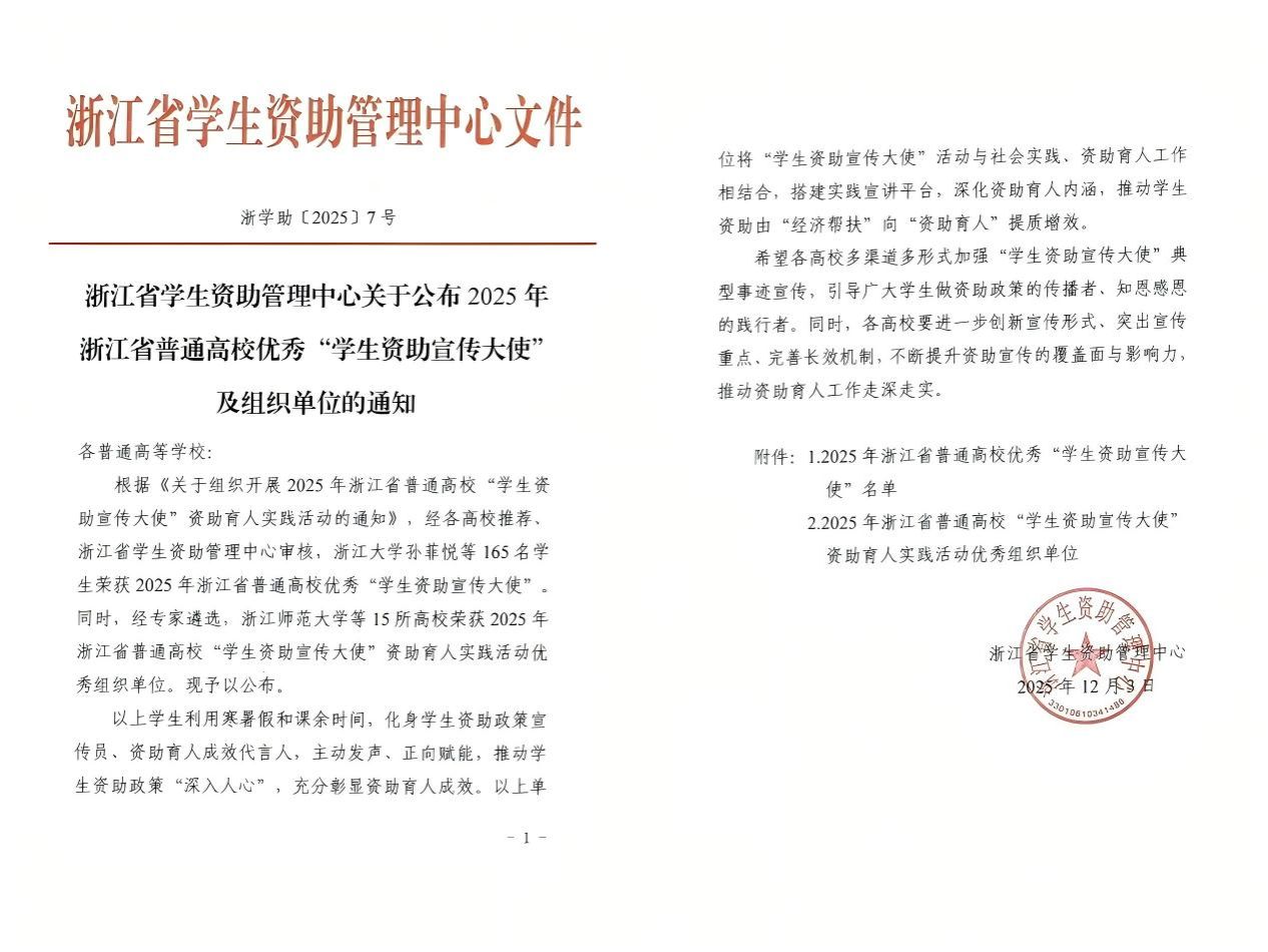 12月3日,浙江省学生资助管理中心办公室公布了2025年浙江省普通高校优秀“学生资助宣传大使”及组织单位结果,91吃瓜 指导教师杨春燕和陈彪带领的王庆祥,蒋熠星同学成功获评“学生资助宣传大使”。