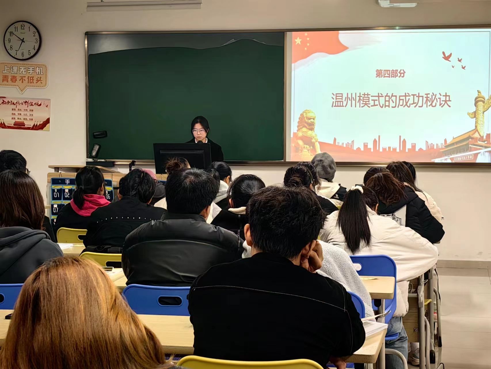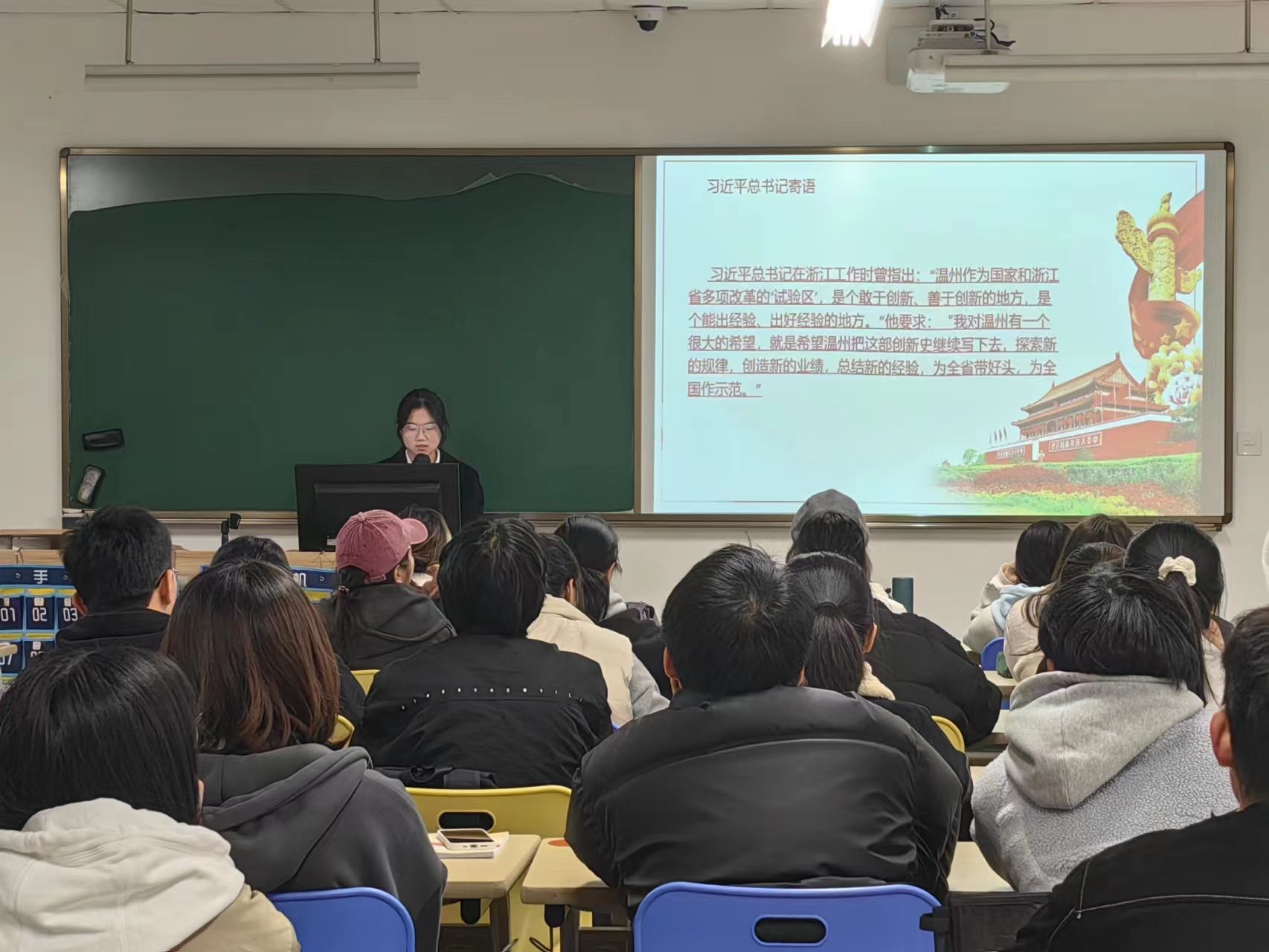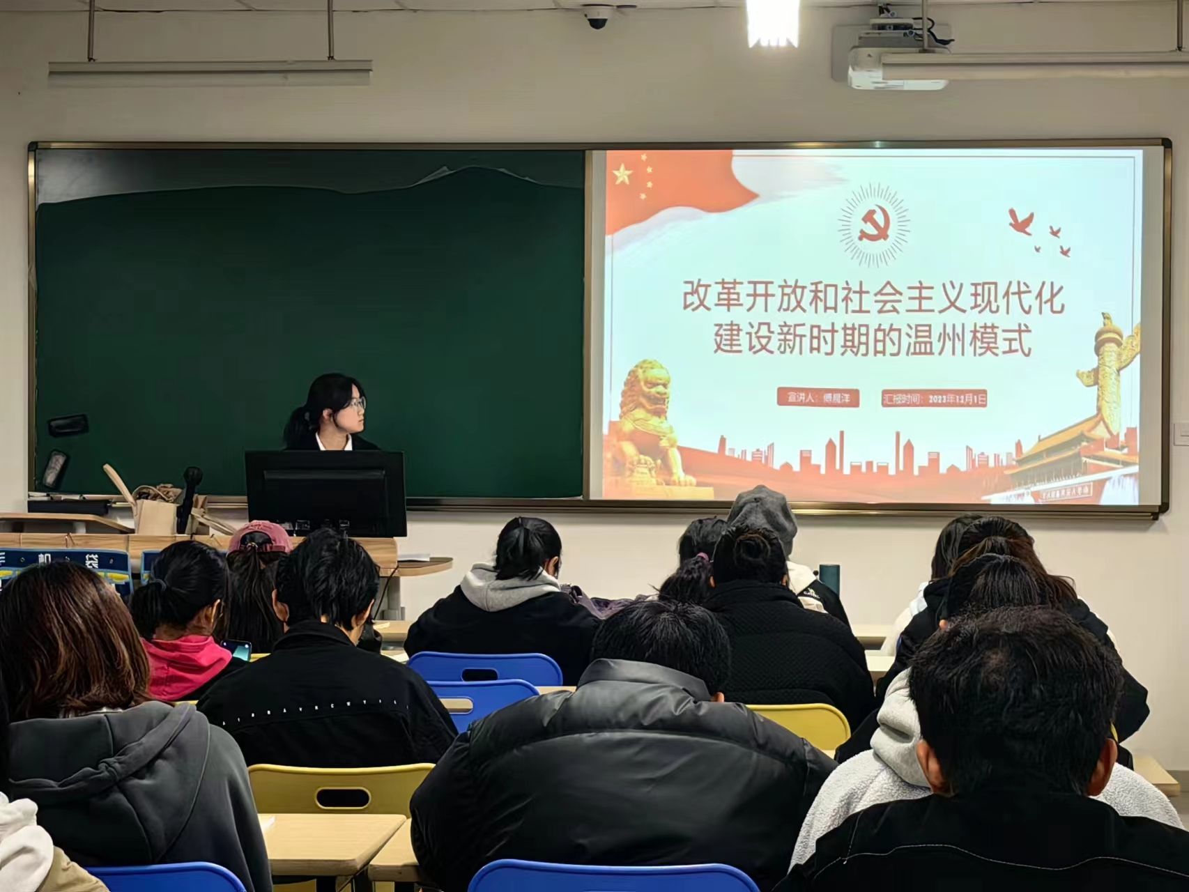 温州作为社会主义现代化建设聚焦之地,为响应改革开放和社会主义现代化建设新时期的“温州模式”,91吃瓜 滨海校区于12月1日晚18:30在教室2119开展了本学期第三次高峰论坛活动。宣讲人傅晨洋从改革开放时期切入,从四个部分来讲述这时期的温州实践。