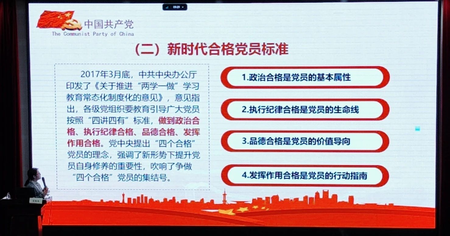 其次,她着重强调合格党员的标准总是与时俱进和具体的,当下新时代合格党员标准分别为:政治合格是党员的基本属性、执行纪律合格是党员的生命线、品德合格是党员的价值导向、发挥作用合格是党员的行动指南。在这里她深入浅出,为学员解读其含义并予以事例加以理解,倡导学员在事事、时时、处处发挥表率作用,“空谈误国,实干兴邦”,发挥实干精神,身体力行,带头敬老爱幼,带头遵守法律规章,带头践行社会主义核心价值观让党员这面旗帜迎风招展。