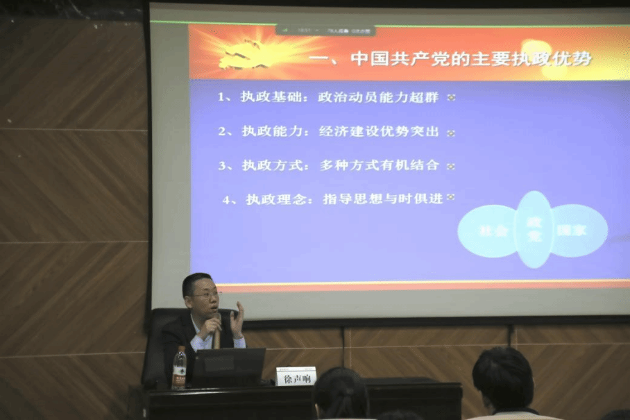 首先,徐声响老师向学员讲述党的执政优势。中国共产党的主要执政优势有四方面。一是执政基础:政治动员能力超群;二是执政能力:经济建设优势突出;三是执政方式:多种方式有机结合;四是执政理念:指导思想与时俱进。而思想理论优势是其中之一,党始终坚持马克思主义为指导,不断推进马克思主义的中国化、时代化,这使得党能够准确把握国内外形势,做出科学的决策部署。此外,党还拥有强大的组织优势,其严密的组织体系和纪律确保了高效的执行力和强大的凝聚力。更重要的是,党始终坚持人民至上的原则,密切联系群众,这为其赢得了深厚的群众基础和支持。
