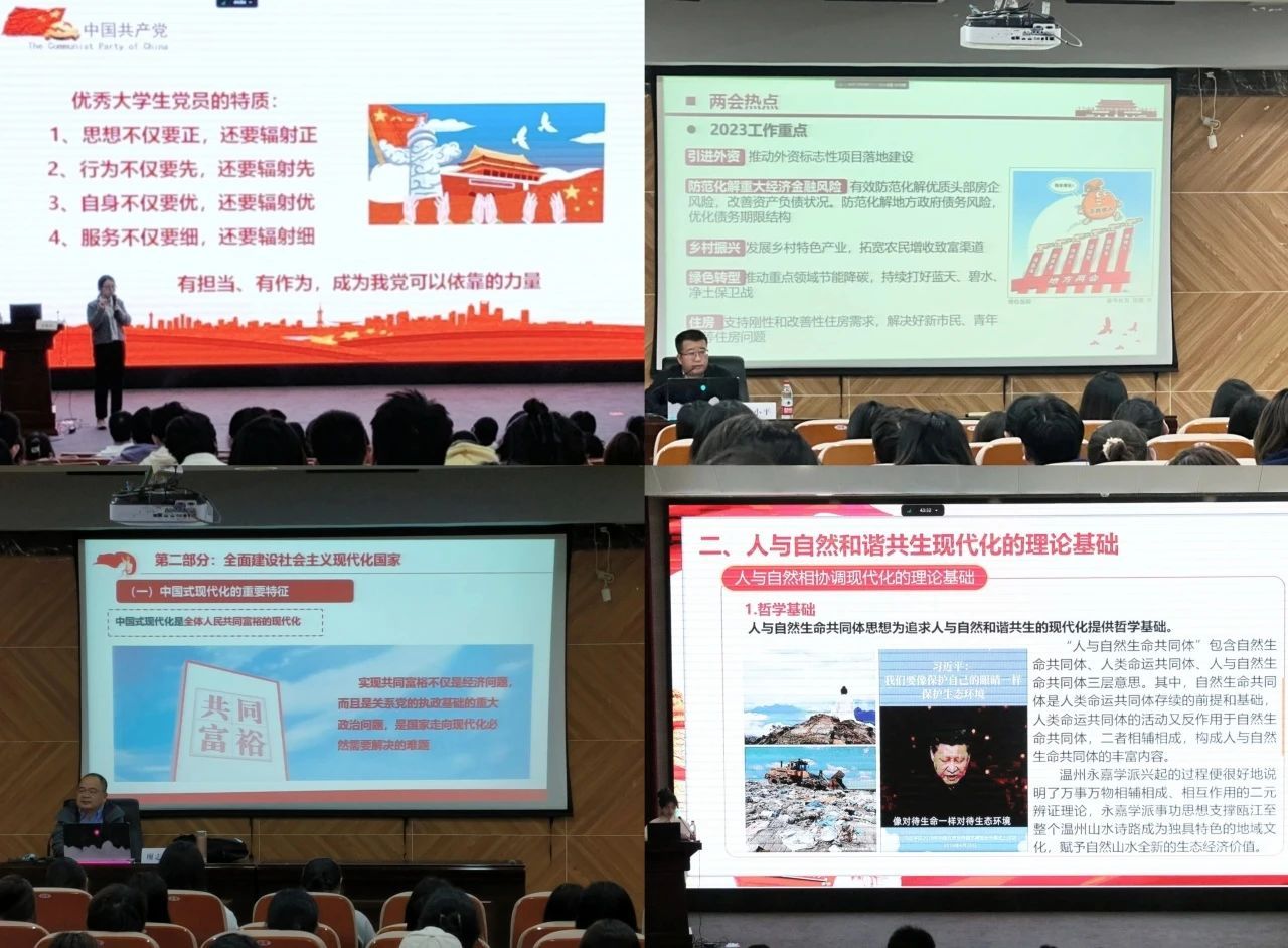 本期培训班把教师授课与朋辈授课结合起来,形成了“书记讲党课”、“专家讲党课”、“同学讲党课”的多元主体授课形式,让学习的形式更为鲜活。以《从成为到合格,从合格到优秀——优秀党员成长之路》为题,学院党委副书记姜旭英深入浅出地为学员们解读合格党员的标准,并辅以生动的例子加以讲解,倡导学员在事事、时时、处处发挥表率作用。马克思主义学院原理教研室主任廖志成《以中国式现代化推进中华民族伟大复兴》,深入阐述了中国式现代化的内涵、特征、本质要求和重大原则,号召同学们要努力成为有理想、敢担当、能吃苦、肯奋斗的时代新人。学院先锋讲师团的多位学生讲师,以青年的视角、鲜活的语言、身边的案例,分别向学员们讲授了《物质文明和精神文明相协调现代化的温州实践》和《人与自然和谐共生现代化的温州实践》两个主题,赢得同学们的掌声与肯定。