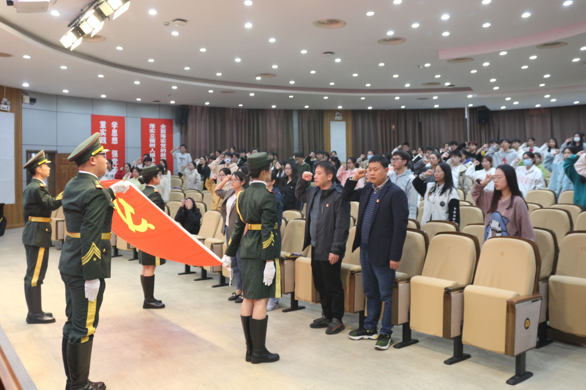“我志愿加入中国共产党,拥护党的纲领,遵守党的章程,履行党员义务......”结业典礼上,护卫队护送党旗入场庄严肃穆,在场全体党员面对鲜红的党旗,高举右手,庄严宣誓,新党员郑重宣誓,老党员重温誓词,蕴含了党员满腔热情和崇高追求,展现了党员的神圣使命和责任,使现场每一位学员的心灵得到了净化和升华,更加坚定了为共产主义事业奋斗终身的理想信念。典礼上,学院分党校对本期党校学习中涌现的优秀学员、优秀学习小组分别进行了表彰,用满满的“仪式感”激发出学员们“深深的荣誉感”。