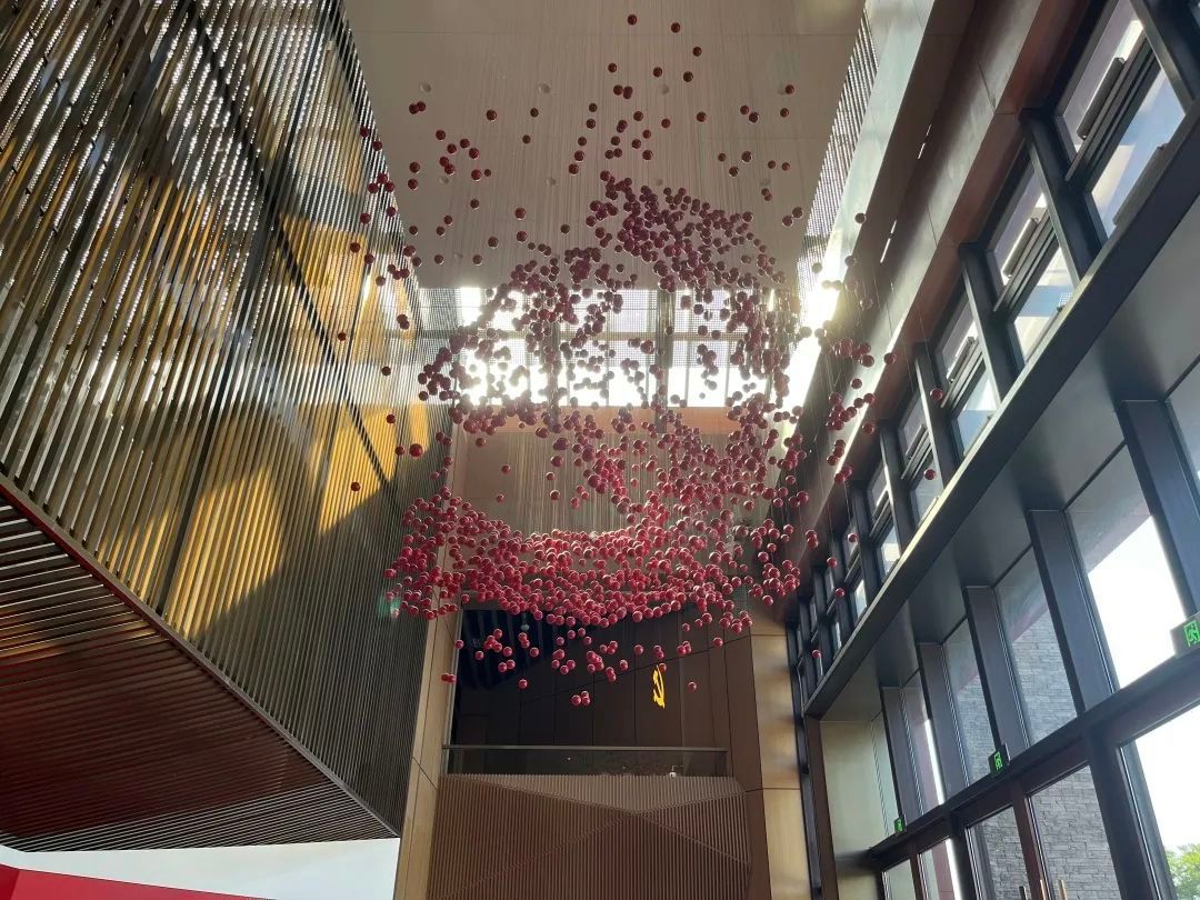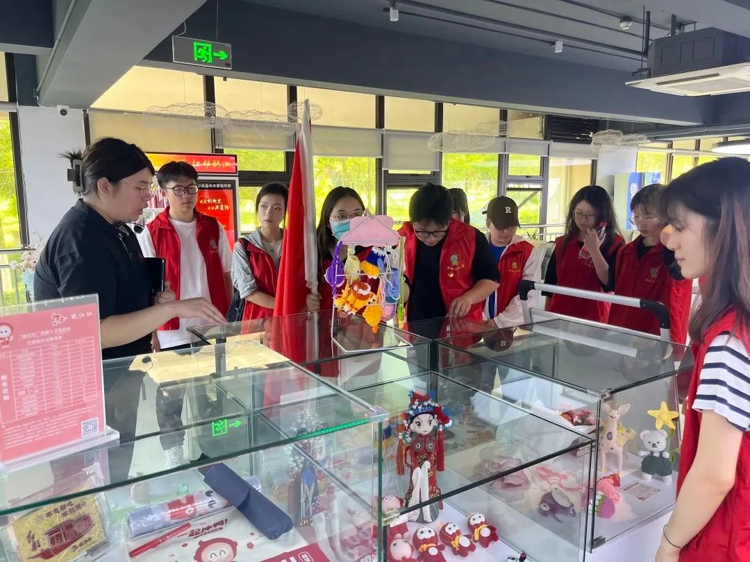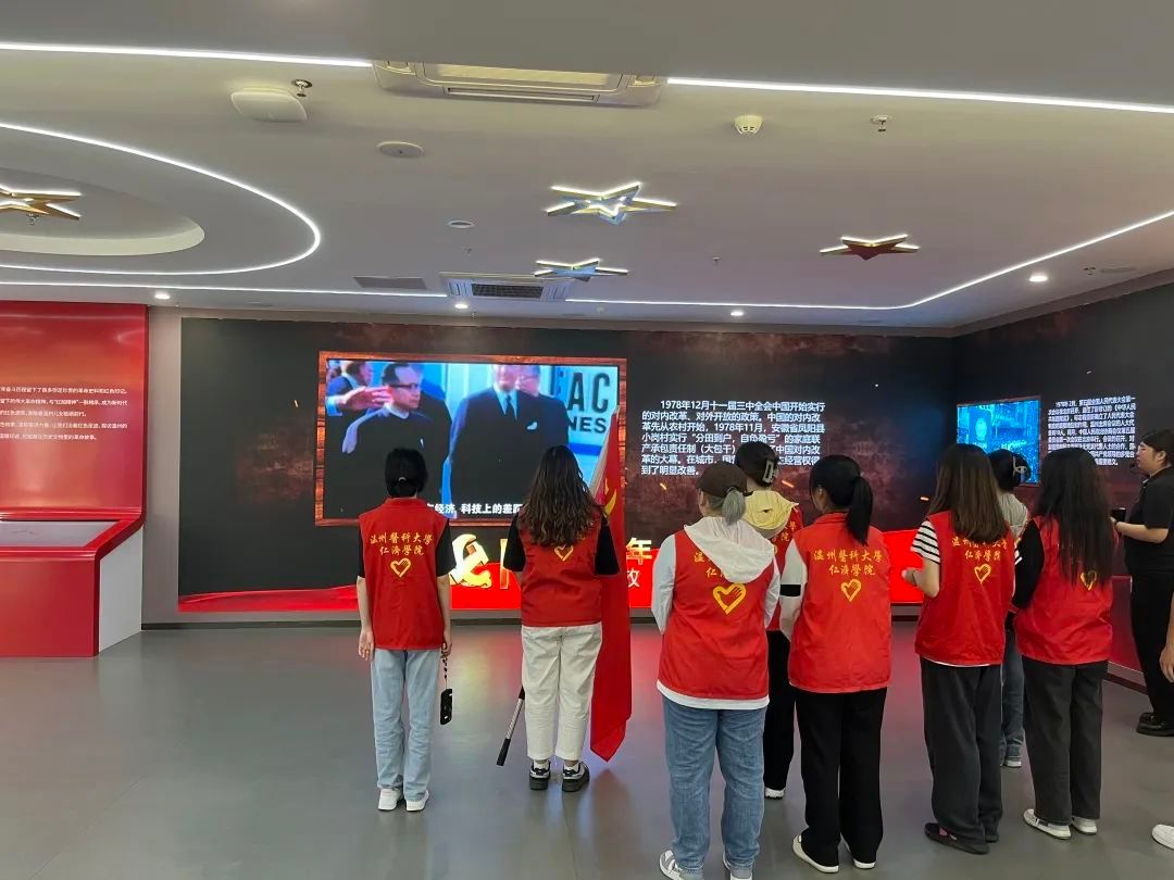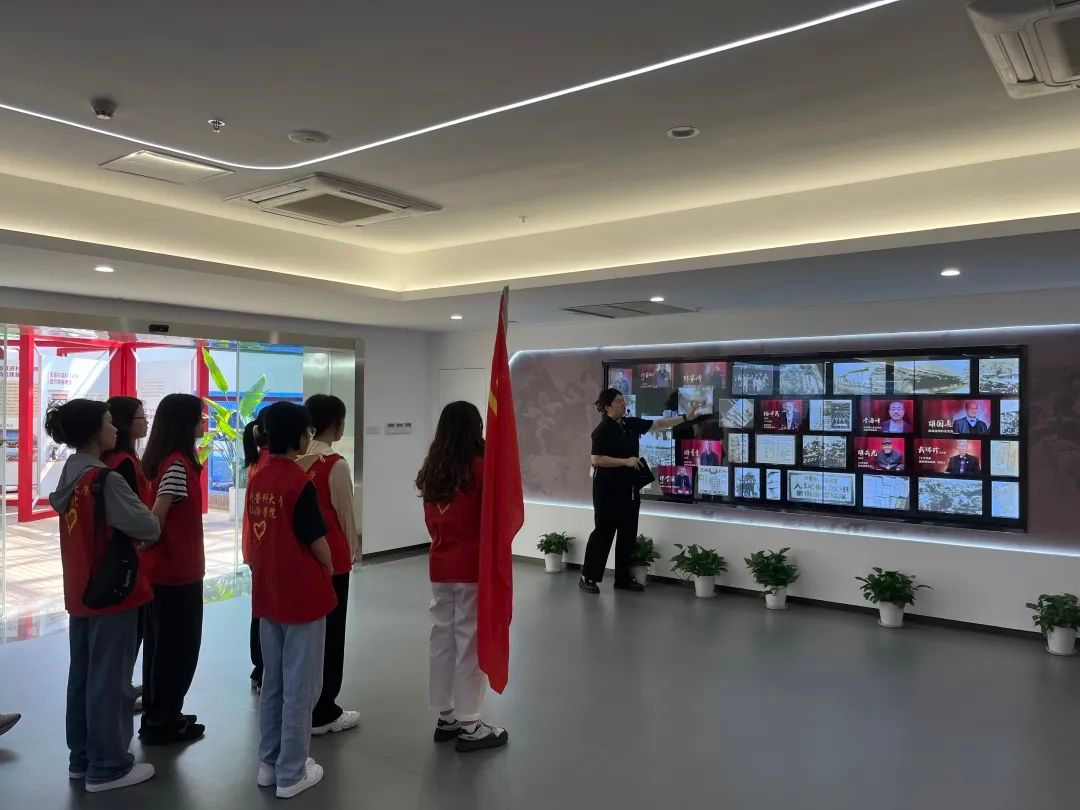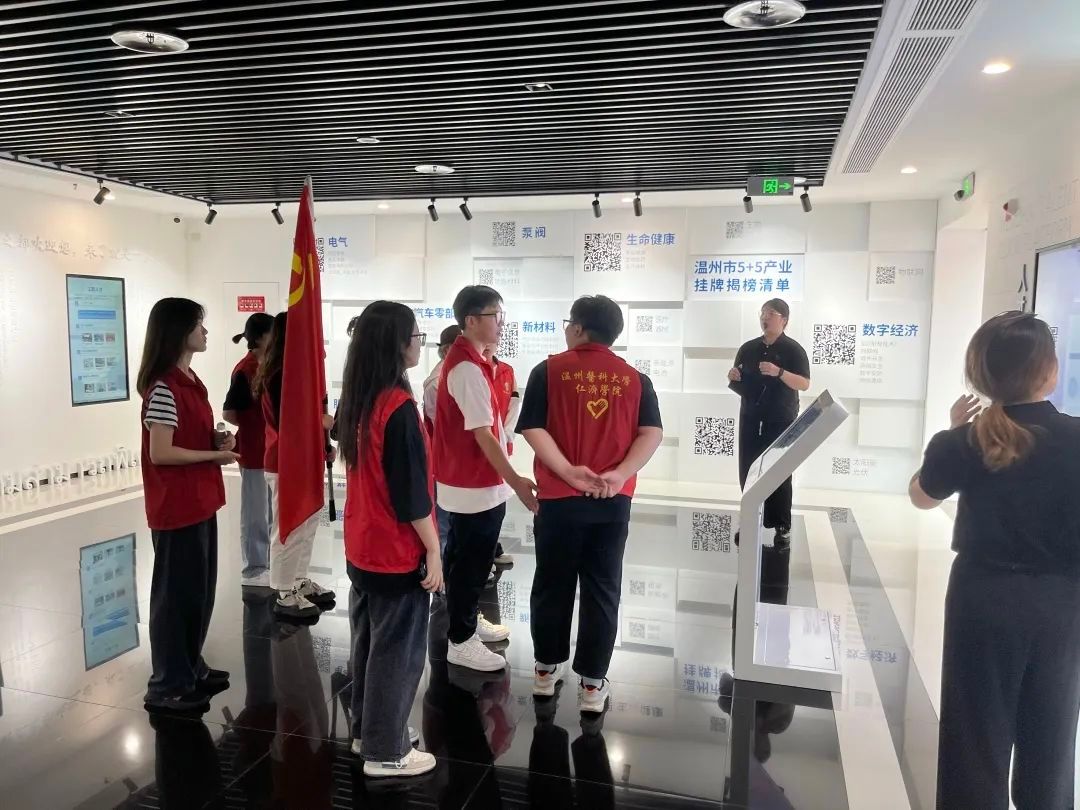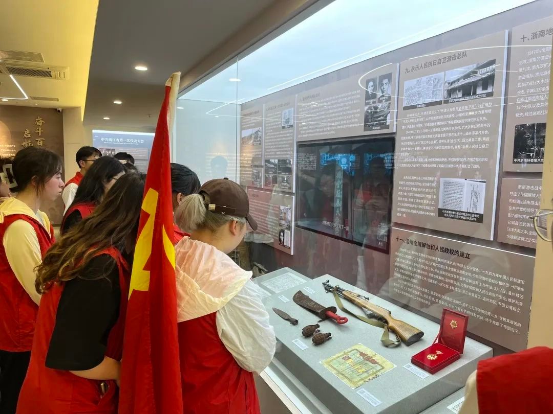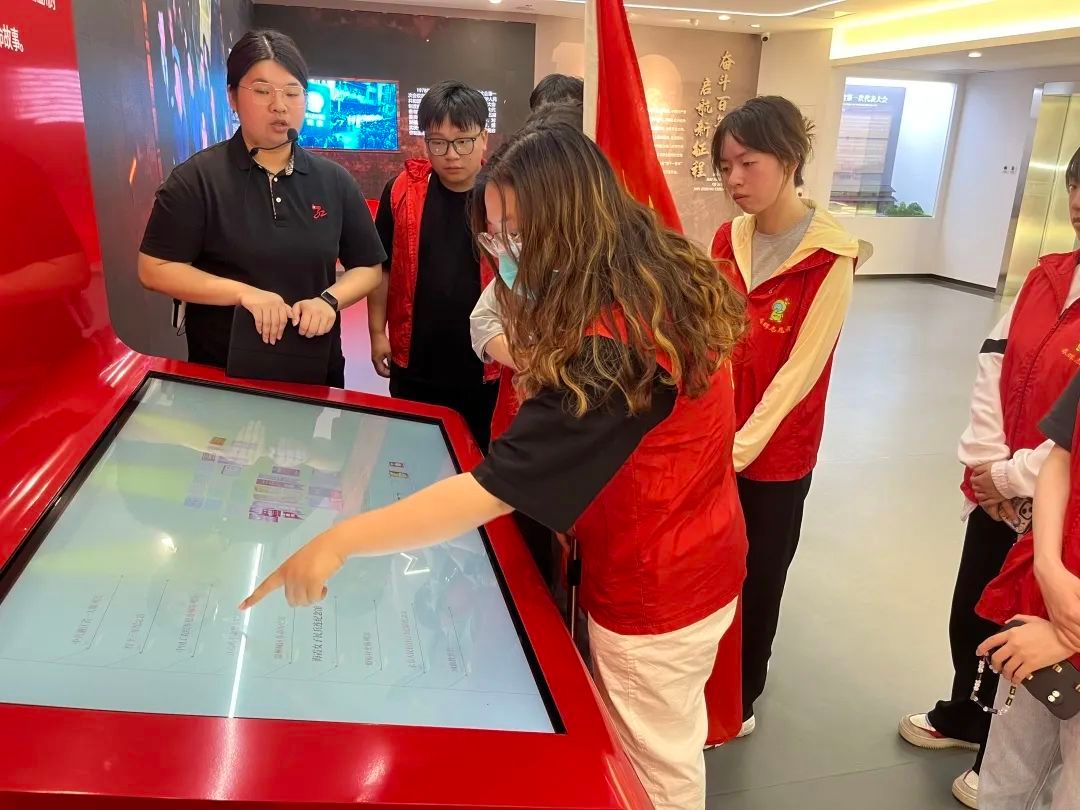 穿过榕源,走近“瓯江红”党建人才综合体,首先映入眼帘的是天花板上的奇妙设计,一颗颗红色的小球,不同角度看过去是党徽,亦是“瓯江红”的标志。在讲解员的引导下,党员们依次参观党史教育馆、红色理想区、主题党日馆、数字沙盘、党群服务等板块。历史的长廊的屏幕上播放着温州人敢打敢拼的发展历程。馆内陈列的藏品见证温州的发展,也见证浙南的红色发展史。通过屏幕上浙南红色发展史的讲解,同学们了解到在浙南这片具有光荣革命传统的土地,祖辈们在党的领导下,英勇斗争、浴血奋战的革命史。与此同时,进一步了解为顺应新时代发展需求,温州开启“人才引进”计划,以系统、具体的政策作为支持,吸引人才,引进人才,为未来温州的发展开辟新的道路。