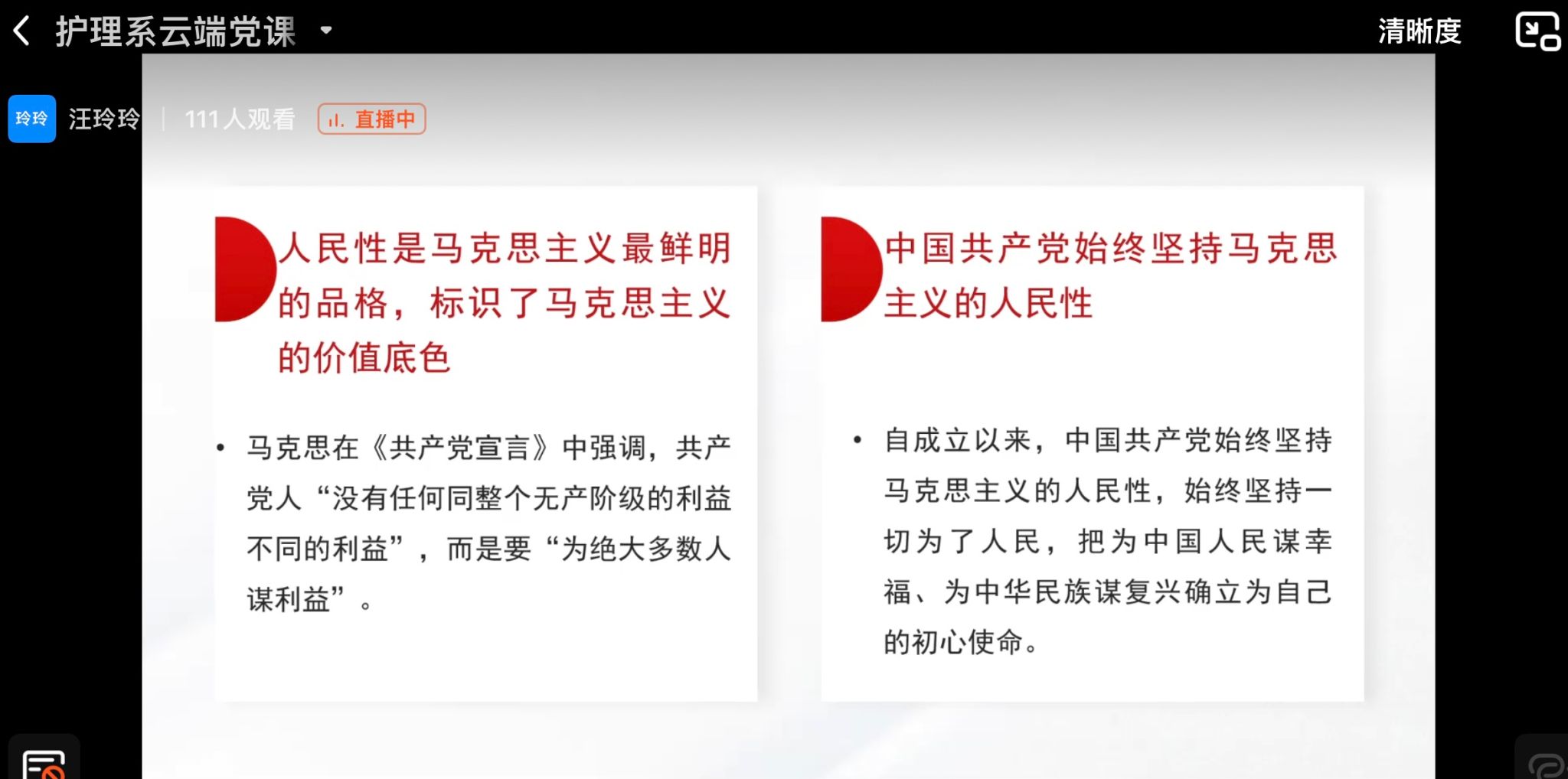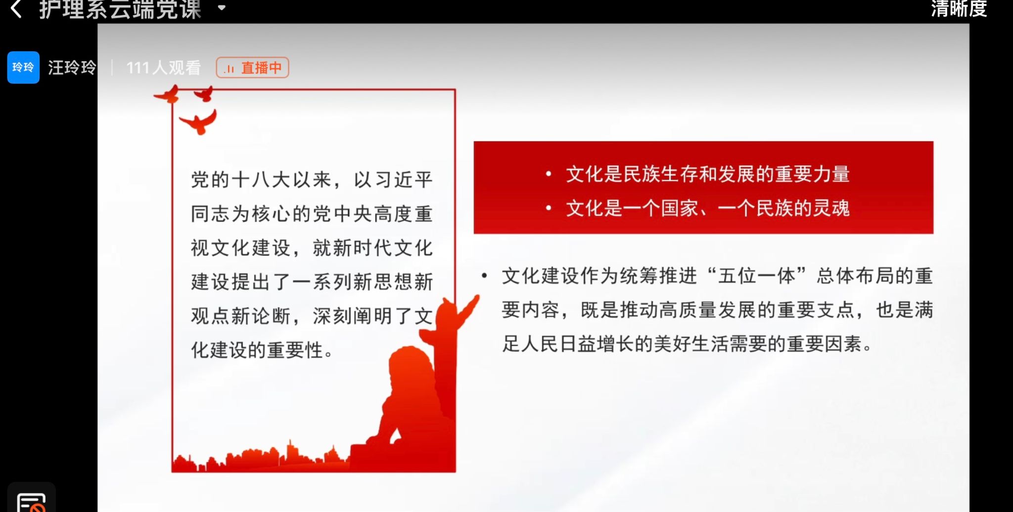 为深刻学习习近平文化思想,护理系第二党支部和护理系第三党支部于2023年12月13日晚上以钉钉直播的方式开展了云端党课,本次党课由护理系党总支书记、护理系第二党支部书记汪玲玲老师主讲。