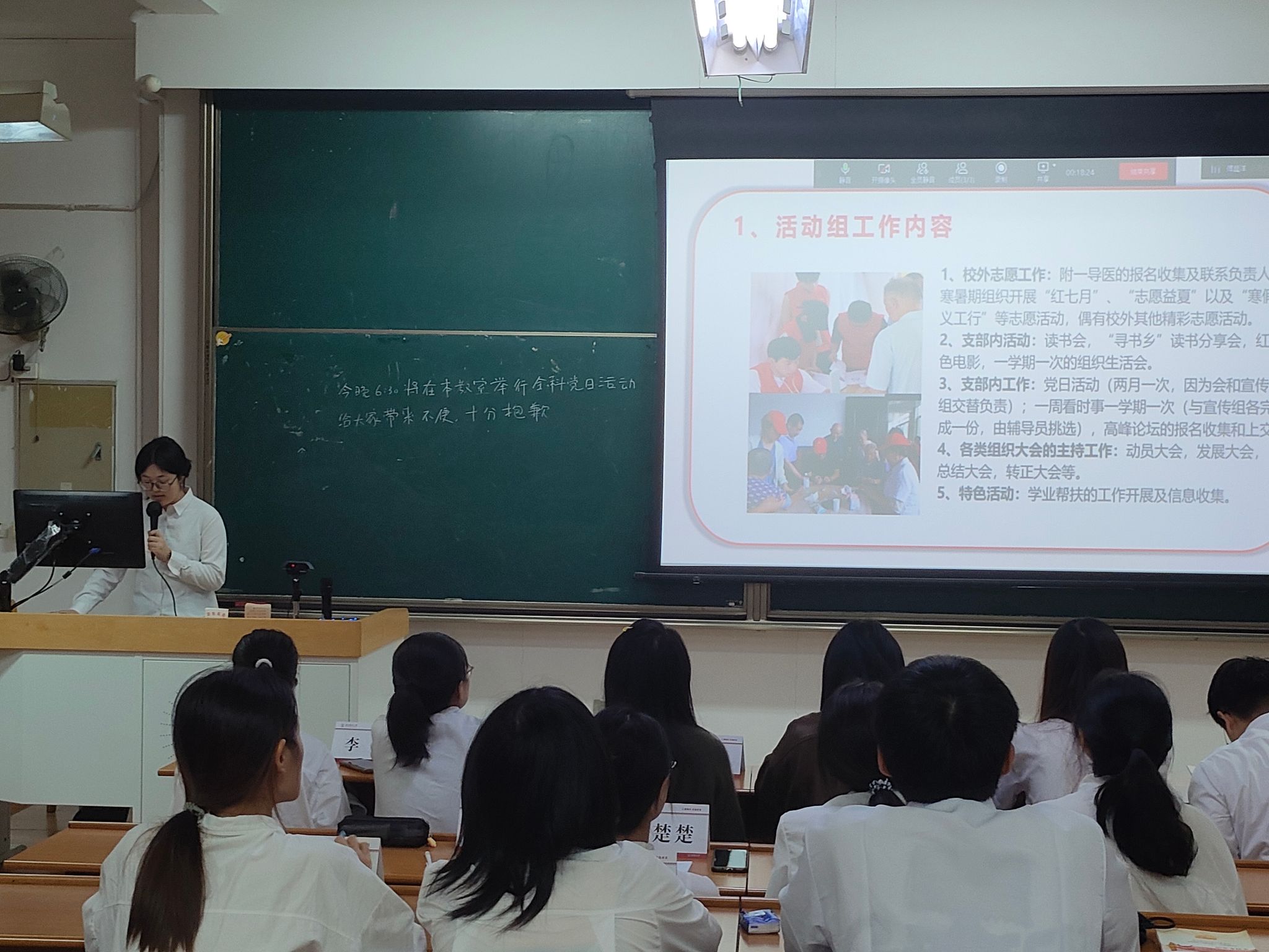 2024年10月29日晚上19:00,91吃瓜 医学一系第一党支部于7AJ101召开本学期的动员大会。本次会议由支部书记田丹老师主持,党总支书记李洁、全体学生党员参与会议。