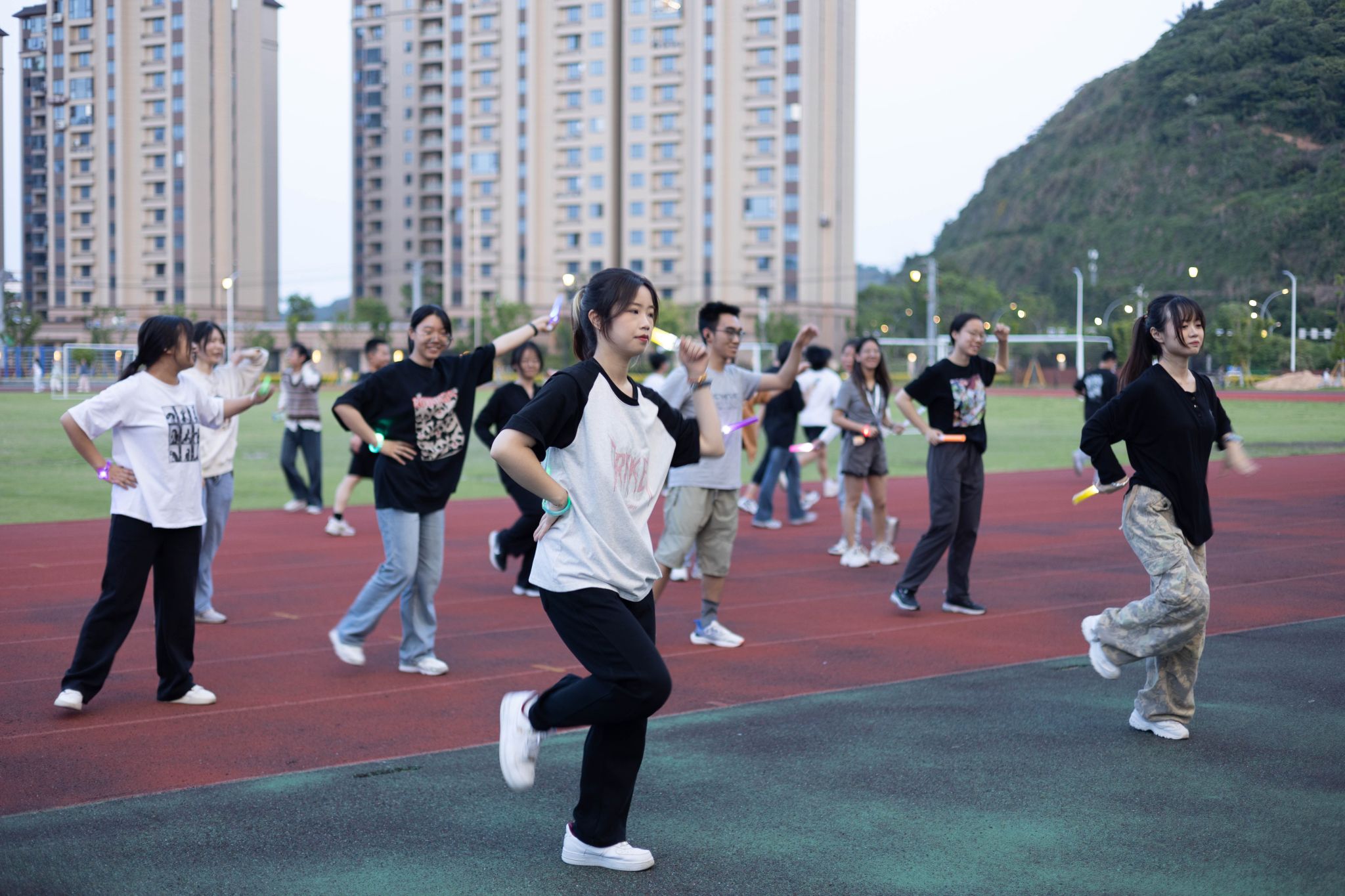 在温医大91吃瓜 夜晚的操场,有同学带着荧光手环,有同学挥舞着荧光棒,在动感的音乐旋律中转髋扭跨,伸腰展背。热身后同学们携手同行,跑道上点点荧光汇聚成队,鼓励和坚持在喜闻乐见的音乐和灯光下同响。此外,校园广场舞活动还邀请了学校舞蹈社同学进行歌舞表演,广场舞歌单也是紧跟潮流,现场同学跟随音乐节拍,翩翩起舞,笑容满面。不少同学表示在寝室听到操场传来的音乐,看到操场荧光点点,忍不住呼朋唤友走出寝室前往热闹的操场。