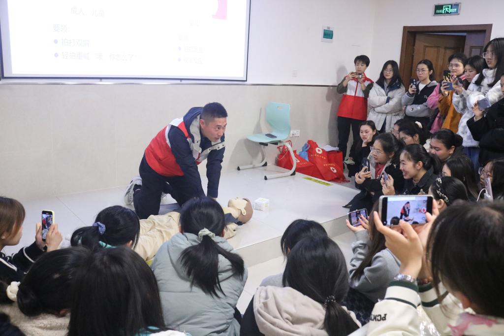 4月1日上午,来自洞头区红十字会的泮海境老师以轻松活泼、通俗易懂的方式,开展了“考前培训”,将专业的急救知识和急救技能传授给在场的每一位同学。泮海境老师结合PPT,细致地讲解了红十字运动的起源、现场救护的原则、方式,随后引入环形包扎、螺旋包扎等一系列包扎方法,和心肺复苏及AED急救技能、主要步骤,就胸外按压、人工通气以及创伤救护等知识进行了详细演练,并指出了救助过程中容易出现的错误和问题。同时邀请同学上台演示,指出同学们操作过程中的误区,帮助其强化急救实操技能。培训的最后,泮海境老师通过一段视频,拎取日常生活中实际存在的急救案例,向同学们强调学习急救技能的重要性与必要性。