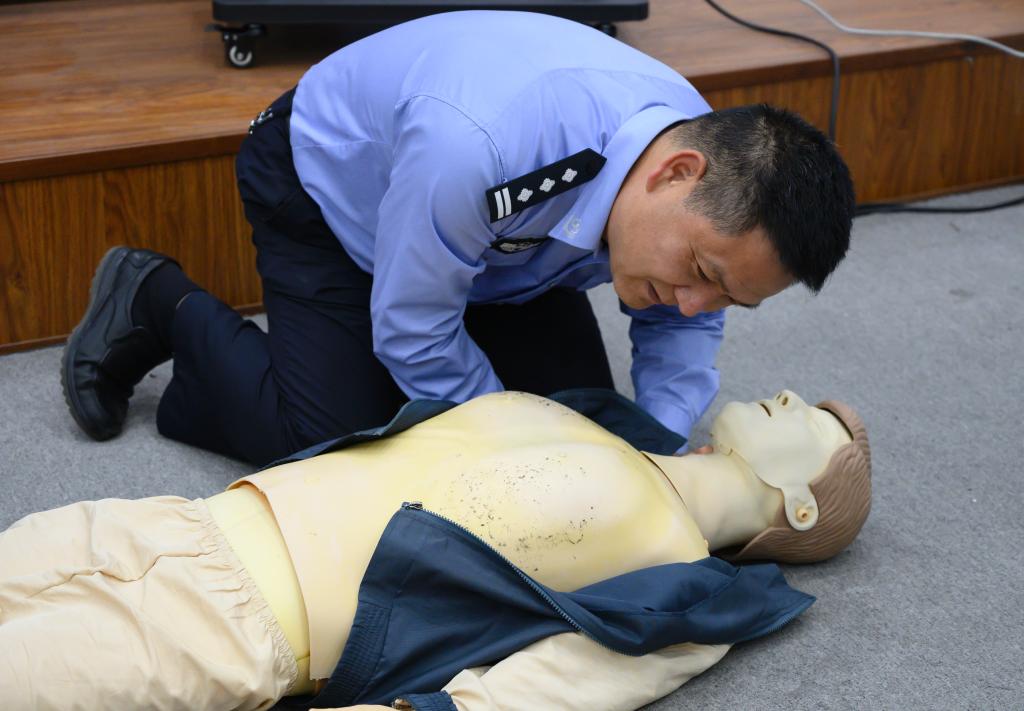 “谁想要来演练一下心肺复苏术?”演示完毕后,培训人员向在座民警、交警发出邀请并得到积极响应。“手掌按压在胸骨下段,掌心别翘起······” 参训民警、交警轮流上台模拟操作,通过人体模具现场练习了心肺复苏的具体操作,包括判断呼吸、摆正体位、清理口腔异物、急救按压、人工呼吸等。培训人员逐一耐心指导,让参训人员系统掌握心肺复苏、人工呼吸、除颤仪使用等技能的操作规范和要领。