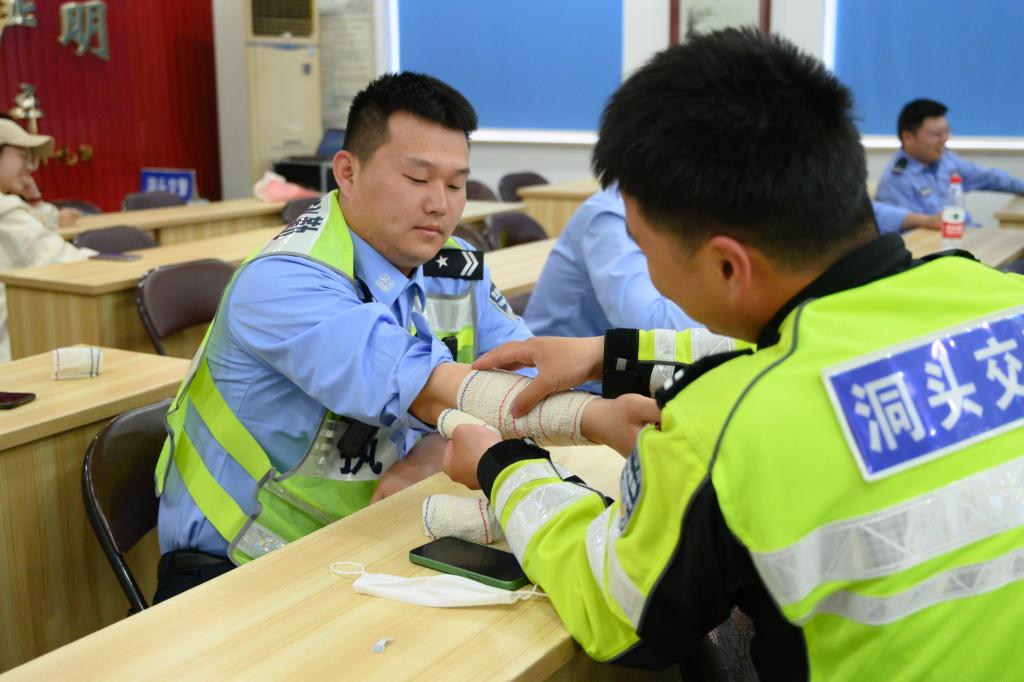 随后,培训人员又为在座民警和交警传授了各类包扎手法的技巧,着重讲解了常用的环形包扎法和三角包扎法。同时,还强调了不同包扎方法对应的不同情况,并让各位参训人员现场进行包扎演练。培训人员手把手纠正民警、交警在操作过程中不规范的救护动作。活动的最后,培训人员为大家展示了多种推拿手法和艾灸的正确操作方法,还将其功效以实际操作的形式呈现于大家面前,并提出让大家一起模拟手法,让大家真切感受到了推拿和艾灸所带来的好处。