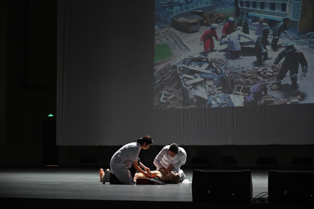决赛主要分为“急救知识竞赛”与“急救小剧场演绎”两大进程。第一进程中,每队成员两两上场,在15秒内细致浏览过急救知识的题目后,按照主持人指令统一举牌展示所选答案。“中国红十字会的宗旨是什么?”“应急救护的目的是什么?”“地震时,怎么逃生?”应急救护知识竞赛环节,各组参赛队员面对问题沉着应答,积极抢答,通过专业知识问答,普及了应急救护专业知识,更是调动参赛选手提升专业素养的积极性。全部答题过程都有裁判在旁实时记录分数,确保大赛公正性。