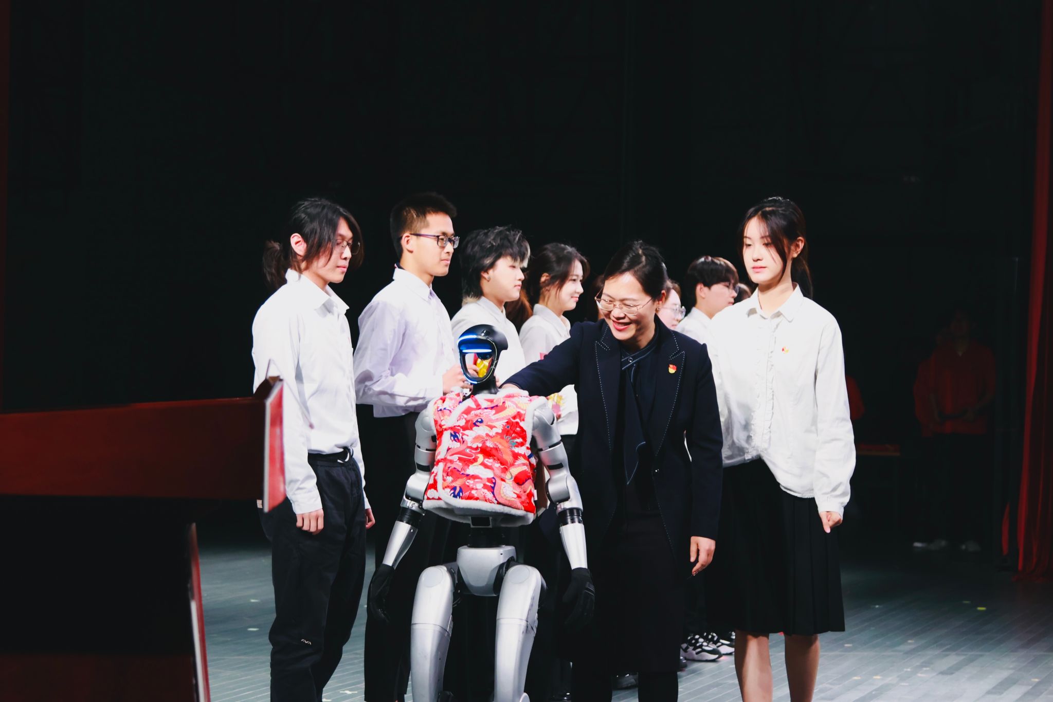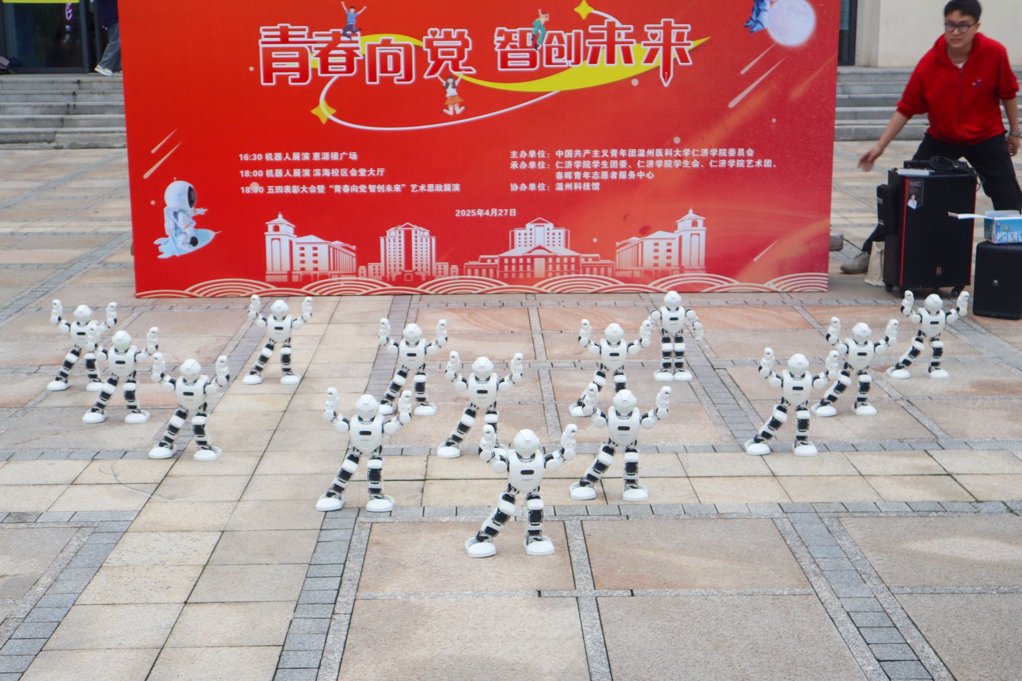 来自温州科技馆的智能机器人以“特殊嘉宾”身份惊艳亮相本次五四表彰活动。当天,它们率先上演两场极具未来感的科技展演。此外在颁奖环节,这些智能机器人化身“科技礼仪”,将证书送至颁奖嘉宾面前。科技与仪式感的深度融合,为整个表彰大会注入创新活力,将现场气氛推向高潮。