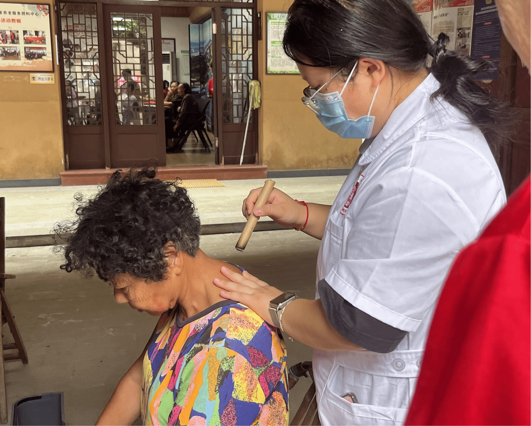 艾灸体验区同样备受青睐。志愿者们运用传统艾灸疗法,精准地为长者进行悬灸操作。现场艾香袅袅,一位体验后的老人欣慰地表示:"肩膀明显轻松多了,感觉很舒服。"这项传统养生技艺在现代志愿服务中焕发新活力,为长者带来身心双重的关怀。