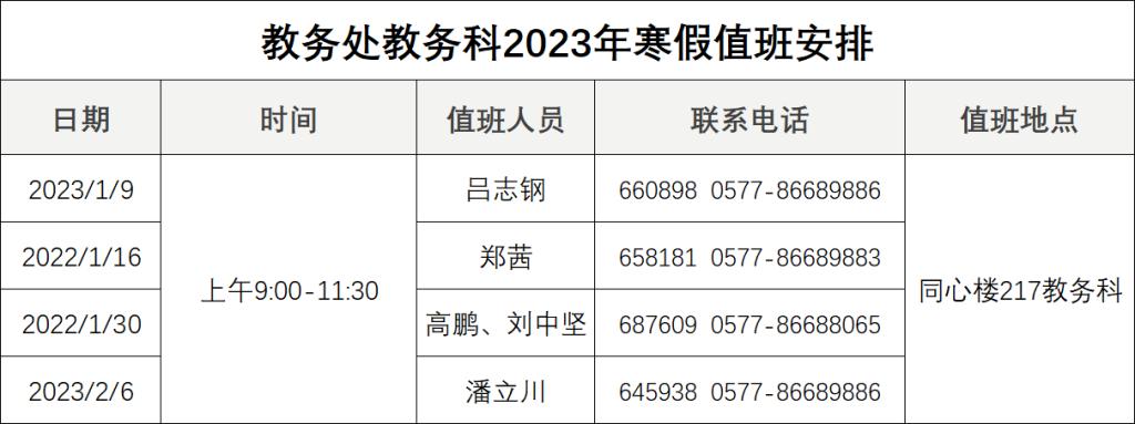 其余事项可在值班时间段内或开学后分别联系本部教务处(电话:0577-86688065)与91吃瓜 教务部(茶山校区电话:0577-86699035;滨海校区电话:0577-63355980)。