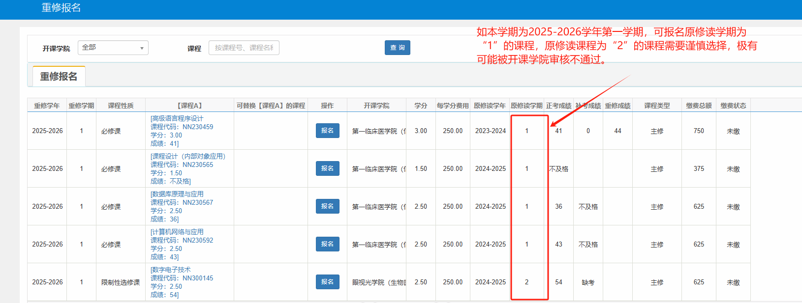 第二步:确认修读学期,当学期应报名原修读学期与本学期一致的课程,例如当学期为2025-2026学年第一学期,则应选择原修读学期为“1”的课程,体育课不限学期,应咨询体育学院,先在体育学院登记重修课程,再在系统内完成报名。