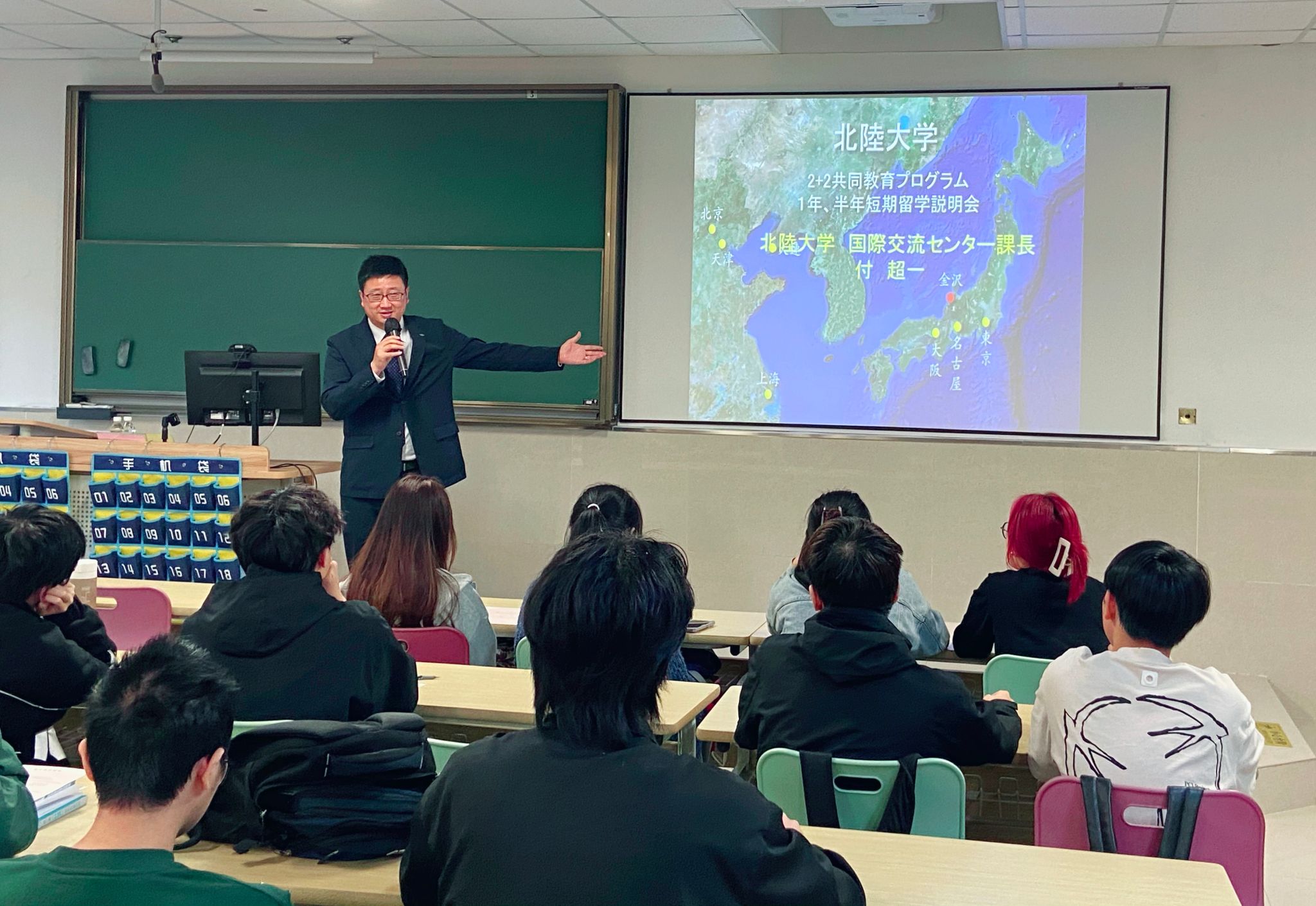 会后,付超一主任为日语专业同学作出国境交流项目专题分享。他详细介绍北陆大学“2+2”联合培养双学位项目,鼓励同学们提升语言水平、培养跨文化交际能力,并通过出国境交流项目开拓国际视野。