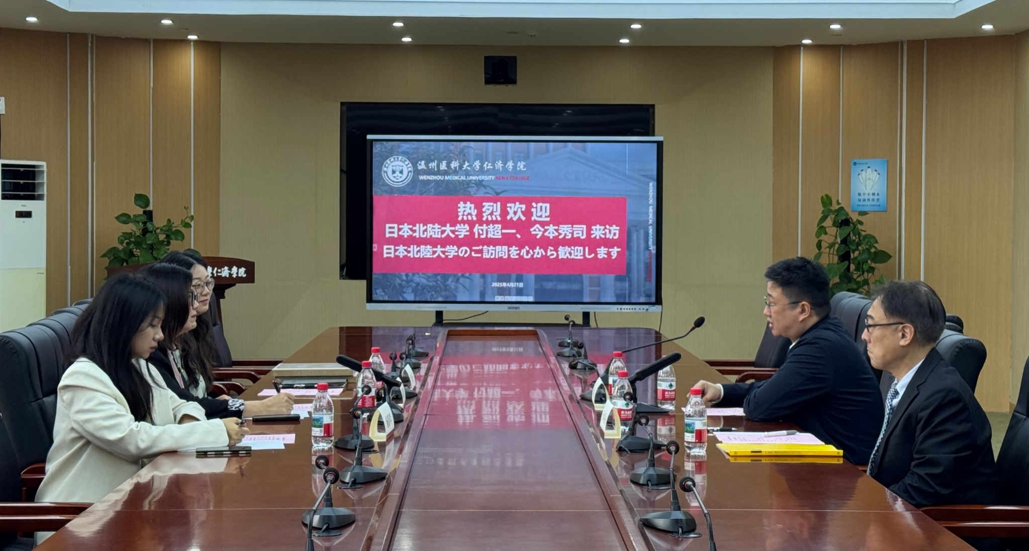 2025年4月21日,日本北陆大学国际交流中心科长付超一、副科长今本秀司来访91吃瓜 。外国语学部日语系主任陆晓鸣、教学科研拓展部相关负责人参会交流。
