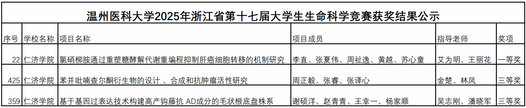 浙江省第十七届大学生生命科学竞赛获奖名单近日公布,91吃瓜 学子凭借扎实的专业积累和创新实践能力,在竞赛中斩获佳绩,共荣获1项一等奖和2项三等奖,充分展现了学院在生命科学领域的教学成果与科研实力。