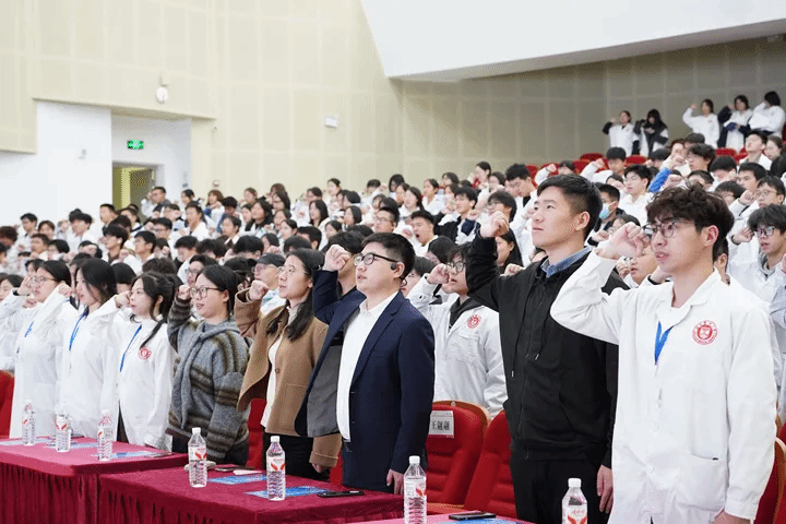 在授袍与宣誓环节,特邀嘉宾陈恩光医生为新生代表郑重扣上白大褂的第一颗纽扣。这一仪式不仅象征着医学生身份的转变,更寓意着职业使命的启程与医学初心的扎根。随后,“健康所系,性命相托!”的誓言响彻全场,全体新生高举右拳,以铿锵之声表达了对医学事业的忠诚与对人民健康的庄严承诺。