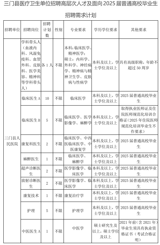 7.其他条件详见《三门县医疗卫生单位招聘高层次人才及面向2025年普通高校毕业生招聘需求计划表》(附件1)。