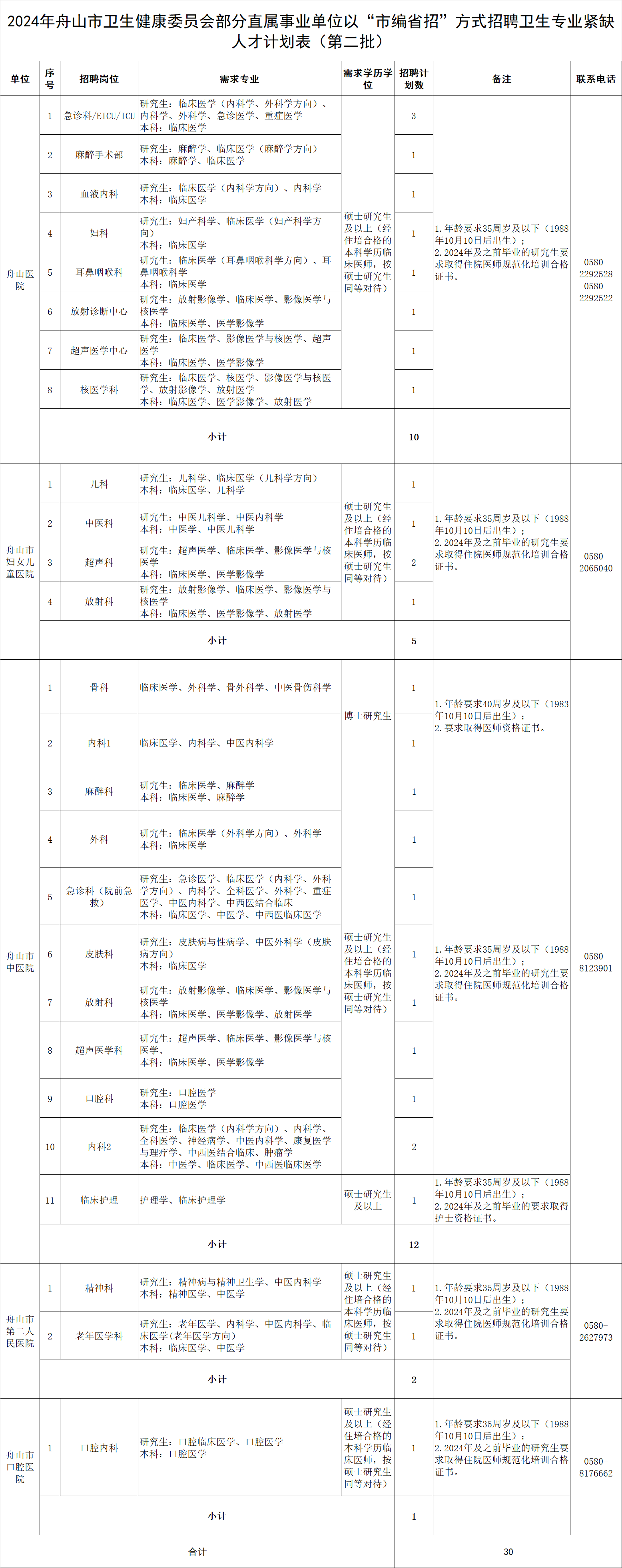 医护招聘|户籍不限|舟山市卫生健康委员会部分直属事业单位招聘紧缺人才30人(市编省招)公告(第二批)2024-10-12